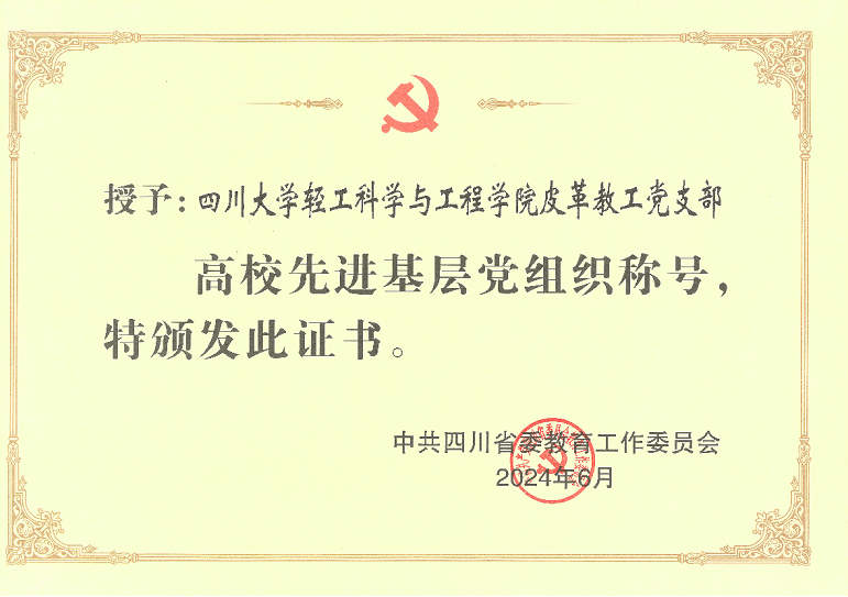 近日,四川省委教育工作委员会颁发了2024年高校“两优一先”证书,77779193永利集团轻工科学与工程学院皮革教工党支部荣获四川省高校先进基层党组织称号。