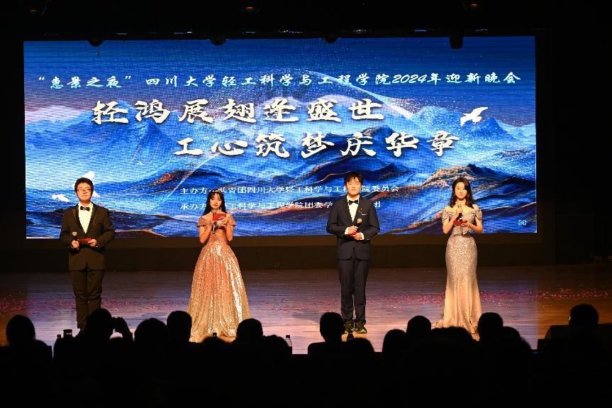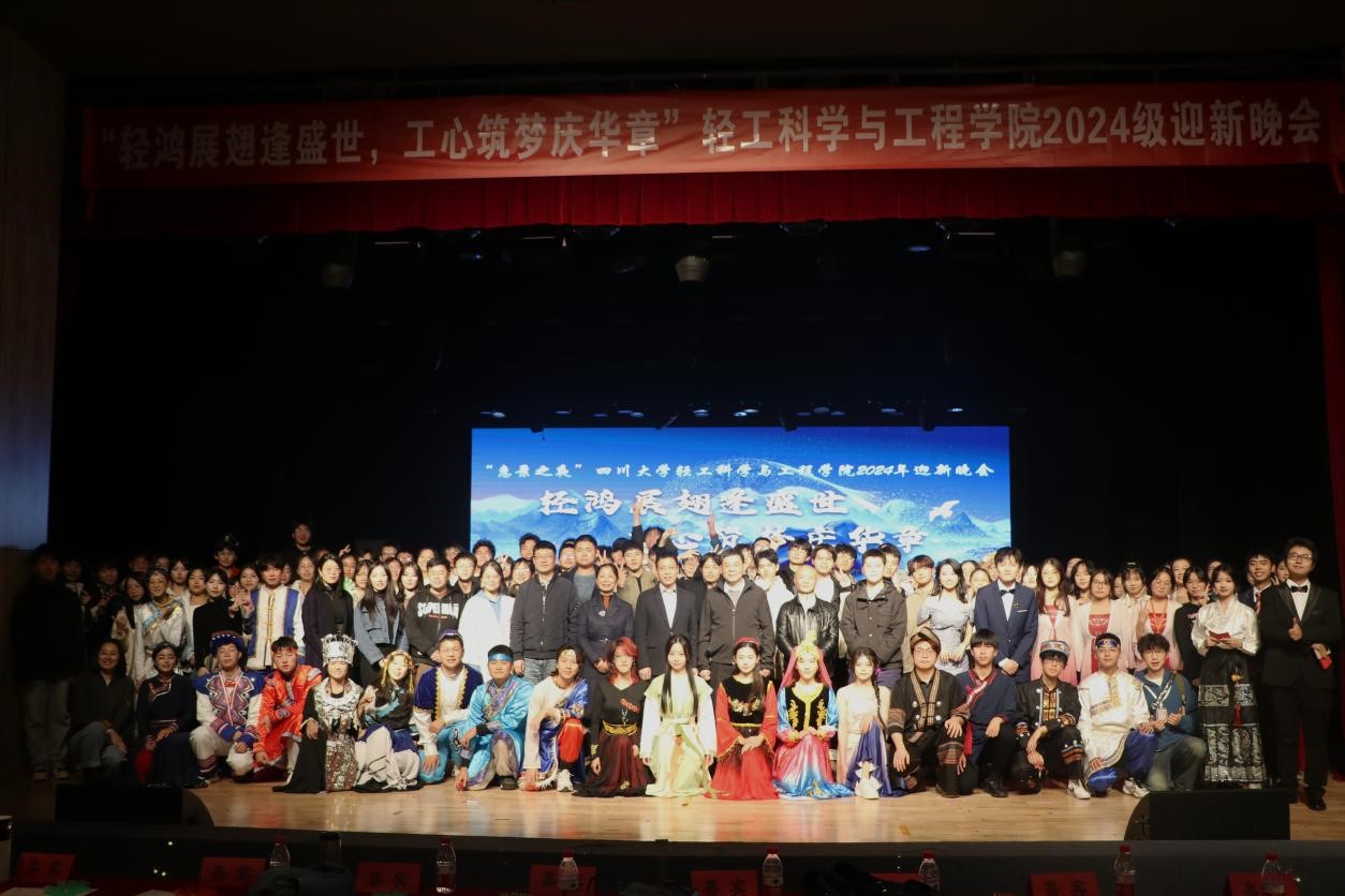 11月24日晚,轻工科学与工程学院在江安校区艺术学院小剧场顺利举办“惠景之夜”2024年迎新晚会。本次晚会以“轻鸿展翅逢盛世,工心筑梦庆华章”为主题,旨在迎接2024级新生的到来。出席本次晚会的嘉宾有轻工科学与工程学院院长彭必雨教授,党委副书记冯国涛副教授,皮革系主任林炜教授,食品系主任吕远平教授,班主任代表刘文涛、蒋和金、卢云浩、夏许寒老师,以及学院教导员邱华明老师,学生事务办公室主任、2022级本科生辅导员贺婷老师,分团委书记、研究生辅导员王舒灏老师,2021级本科生辅导员贾欣驹老师,2024级研究生辅导员尚娇娇老师,2024级本科生辅导员余昕玲老师。学院2024级全体新生参加了本次晚会。