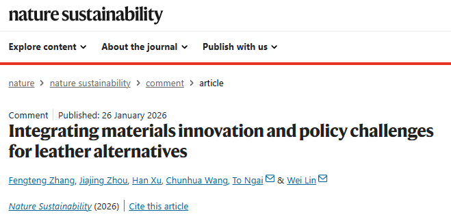 2026年1月26日,我院林炜教授对生物基皮革替代品(类皮革材料)面临的挑战和机遇进行了评述,相关论文以Integrating Materials Innovation and Policy Challenges for Leather Alternatives为题,发表于Nature Sustainability。文章系统介绍了生物基皮革替代品的材料组成及制备方法,深入分析了这类新型材料在产品性能和制造方面所面临的问题。文章最后探讨了生物基皮革替代品在开发和应用中的挑战,指出了潜在的研究方向,旨在为创新材料的研发提供参考。