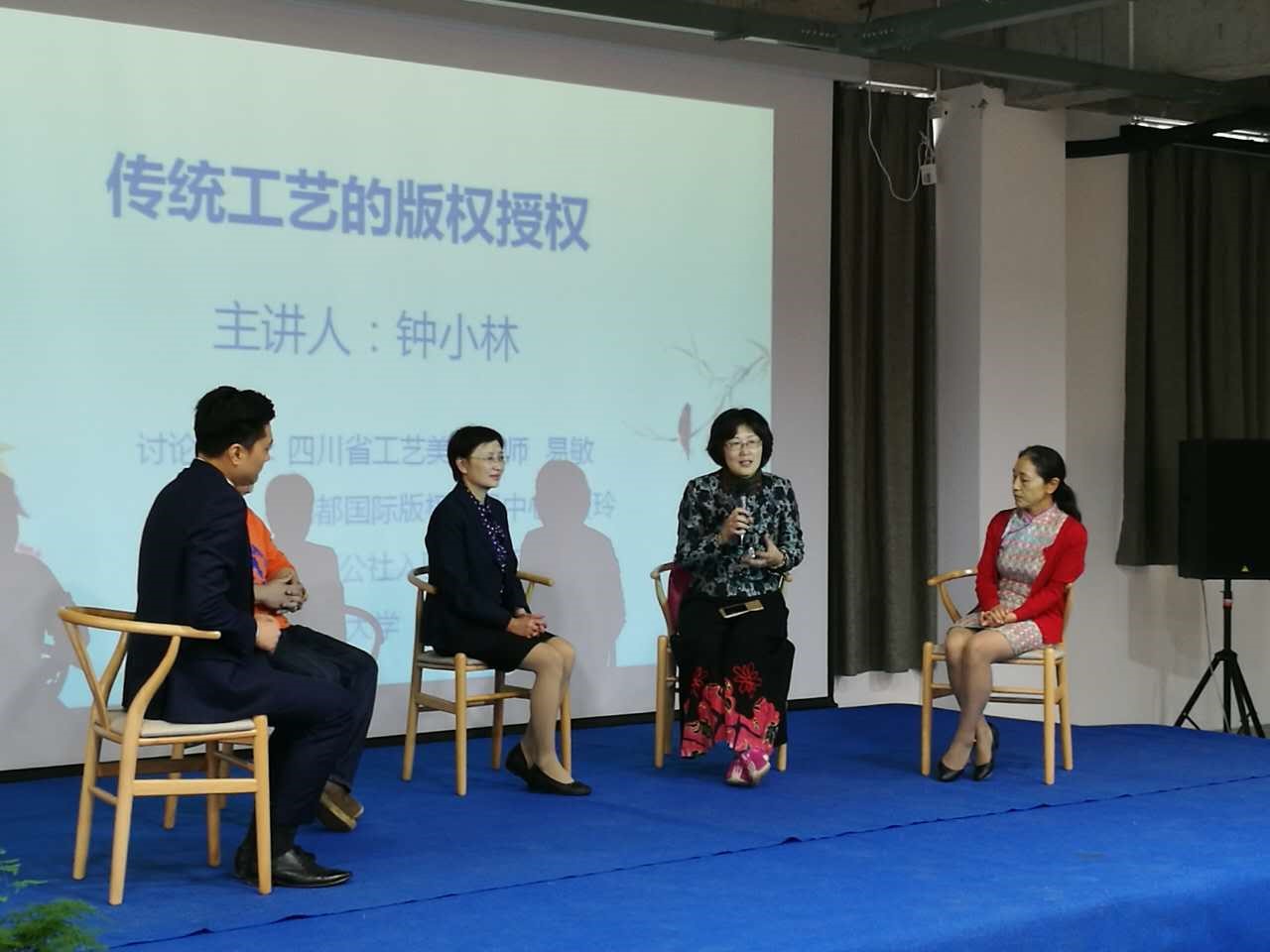 颁奖典礼后,成都市文广新局委托成都国际版权交易中心为开展蜀绣版权保护,切实维护蜀绣设计者的权益,杜绝盗版假冒,开展了“蜀绣版权与品牌运营研讨会”。我院蜀绣蜀锦研发实验室赵敏老师与成都国际版权交易中心总经理黄玲,四川省工艺美术大师易敏老师等专家一起现场分享了经验、提出了建议。
