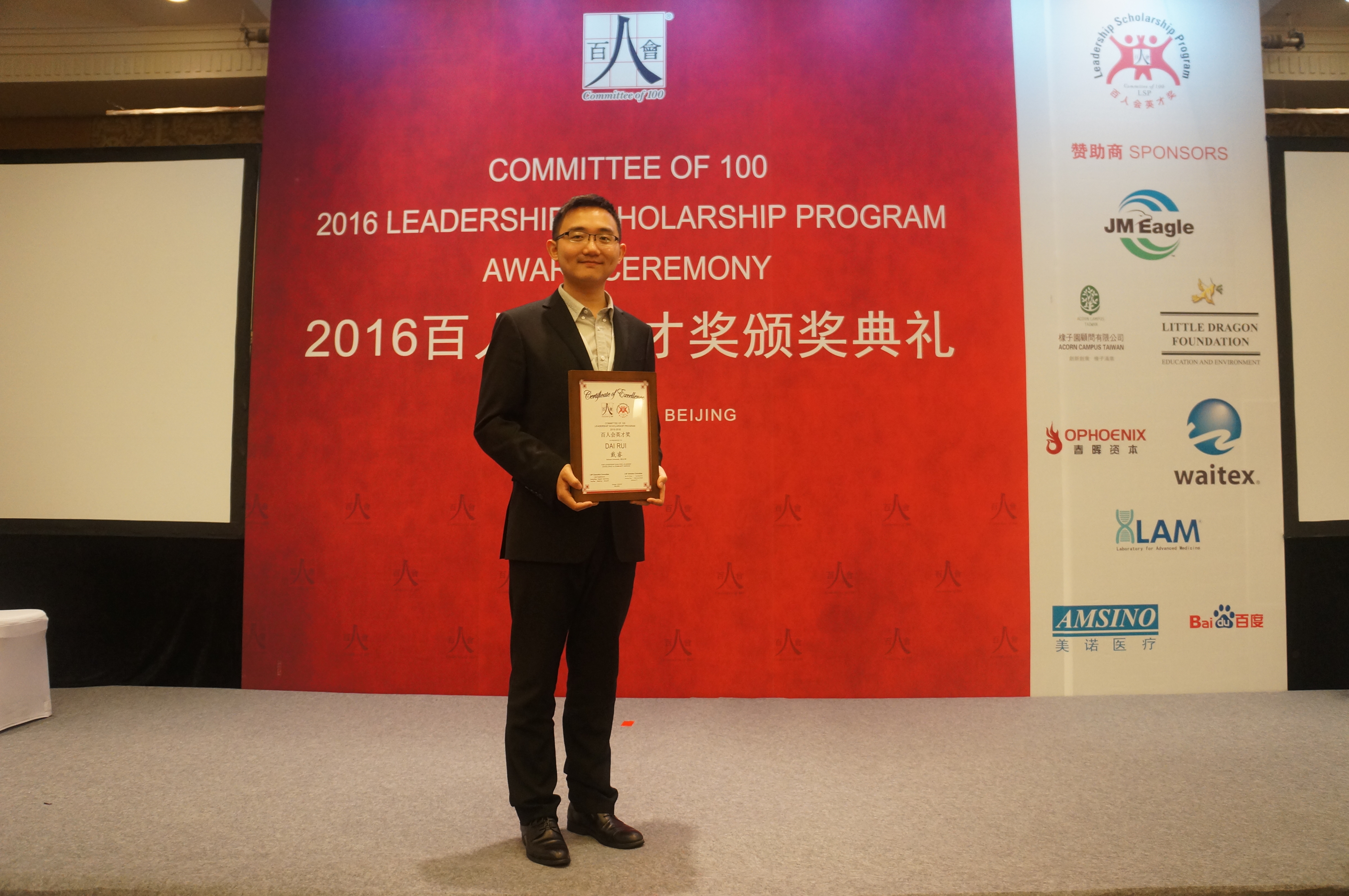 10月29日,2015-2016年度“百人会英才奖”颁奖典礼在北京举行,来自全国16所知名高校的32名研究生获此殊荣,我院2013级博士研究生戴睿荣膺该奖。百人会会长吴华扬、百人会大中华区联席主席汪大总、百人会英才奖执行委员会主席曾宪章等出席了颁奖活动。
