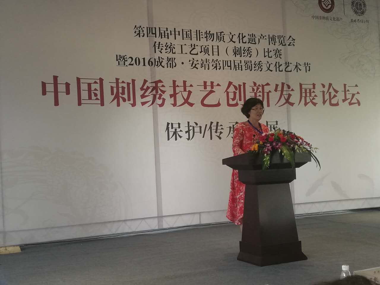 在“中国刺绣技艺创新发展论坛”上,蜀绣国家级非遗传承人郝淑萍、苏绣国家级非遗传承人姚建萍、杭绣国家级传承人陈水琴分别做了精彩发言,我院赵敏老师也受邀做了“创新是刺绣发展的引擎,也是传承的保证 ”的专题发言。