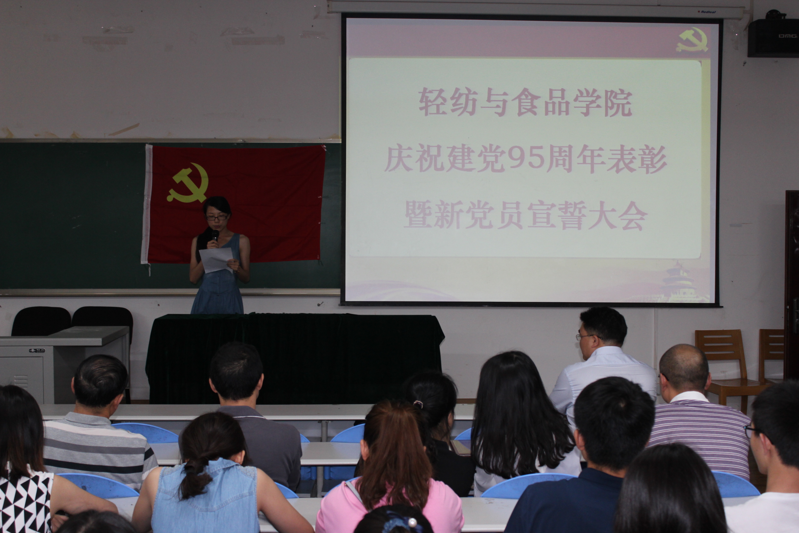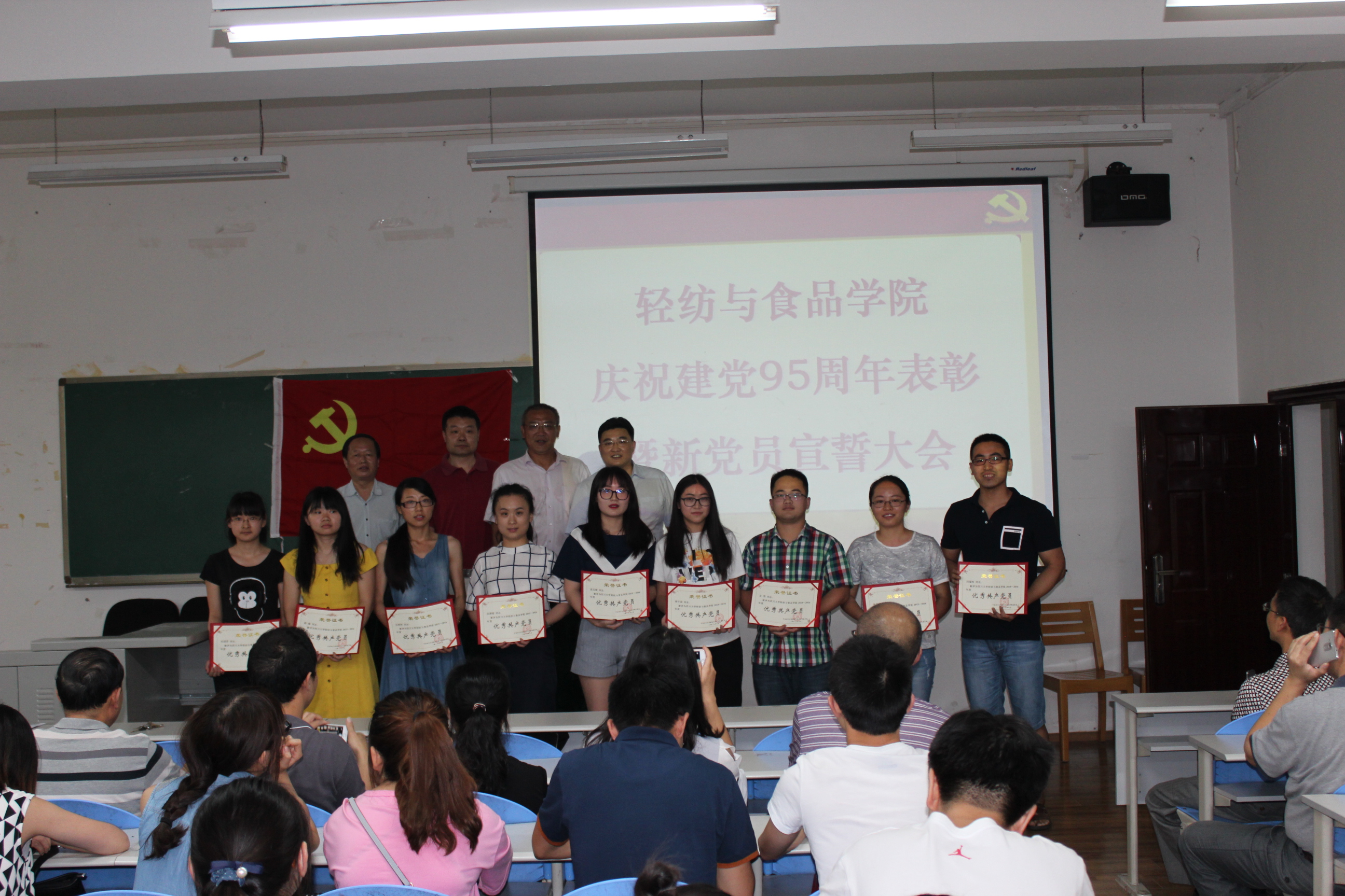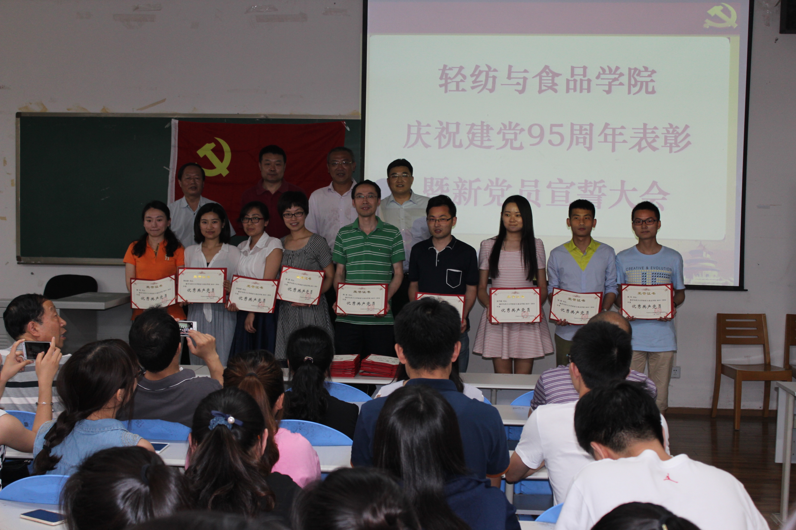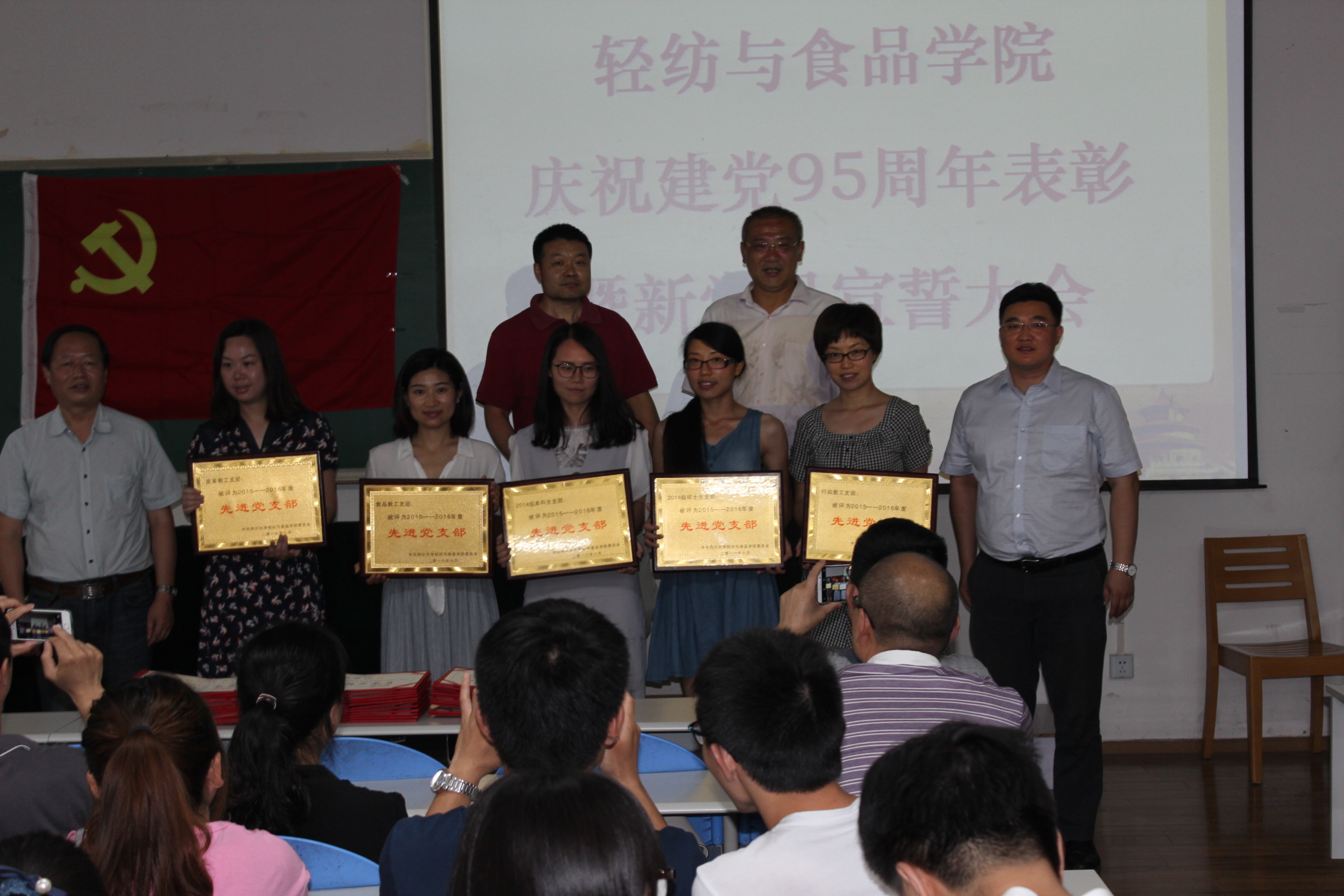 6月12日下午,我院全体党员在纺工副楼205会议室举行建党95周年表彰暨新党员宣誓大会。会议由院长何有节教授主持。他向获得表彰的支部和师生表示祝贺,希望他们再接再厉,再创辉煌。赵毅书记发表了热情洋溢的讲话,他说,今年是国家十三五的开局之年,是学校一流学科和一流专业建设之年,也是学院制定新的发展目标,实现跨越式发展的起步之年,学院党委将紧紧团结和依靠全体党员和全院师生,坚持“围绕中心抓党建,抓好党建促发展”,高举中国特色社会主义的伟大旗帜,以邓小平理论和“三个代表”重要思想为指导,深入贯彻落实科学发展观,认真学习习近平总书记系列讲话精神,认真开展“两学一做”专题教育,充分发挥基层党组织的核心作用,党支部的战斗堡垒作用和党员的先锋模范作用,不断加强理想信念教育,牢记党的宗旨,不辱使命,以实际行动来迎接建党95周年,为早日实现学校建设一流综合性大学的奋斗目标而贡献自己的力量。 接着,肖凯副院长宣读了获奖名单,学院领导为获奖的支部和师生党员颁奖。2014级硕士生党支部书记江明芳同学,作为优秀党员代表发言。最后,刘晓虎副书记作为领誓人,主持了新党员的宣誓仪式。大会圆满落幕!