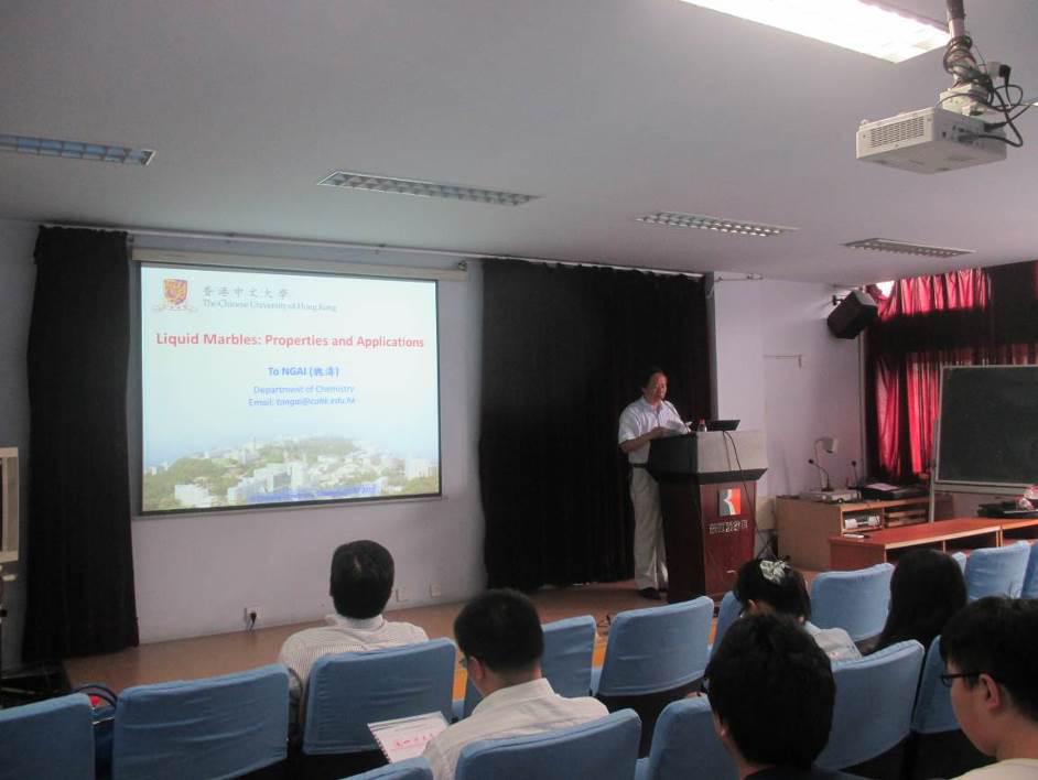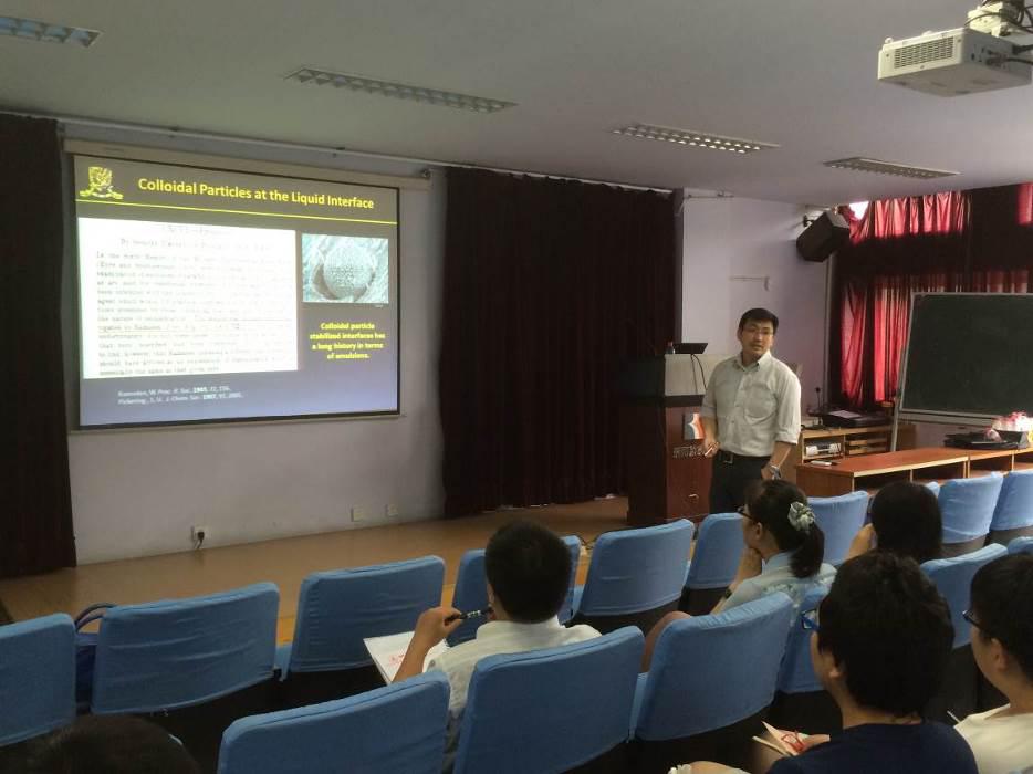 应77779193永利集团轻纺与食品学院邀请,香港中文大学化学系魏涛教授于2015年7月1日在我院访问,并在皮革楼2楼学术报告厅为我院师生作了一场题为“Liquid Marbles: Properties and Applications”的学术报告。报告会由轻纺与食品学院院长何有节教授致欢迎辞,生物质与皮革工程系副系主任林炜教授主持。魏涛教授在报告中对Liquid Marbles的制备原理与方法、独特性质及其作为微型反应器在不同领域的用途等方面的研究工作及最新进展做了详细的介绍。魏涛教授的报告紧抓国际学术前沿研究,内容新颖,讲解深入浅出、思路清晰,激起了聆听报告师生的浓厚兴趣。报告结束后,魏涛教授与学院部分师生进行了交流和讨论。魏涛教授于2003年获香港中文大学化学系化学博士学位,2003年-2005年在德国巴斯夫公司任职,2005年7-12月在美国明尼苏达大学做博士后研究,2006年1月起在香港中文大学化学系任教。目前主要研究领域包括:高分子、胶体粒子和软物质的设计和合成及其相互作用研究等。魏涛教授近年在Angewandte Chemie International Edition、Chemical Communications、Macromolecules、Soft Matter和Langmuir等国际核心学术刊物发表论文80余篇。