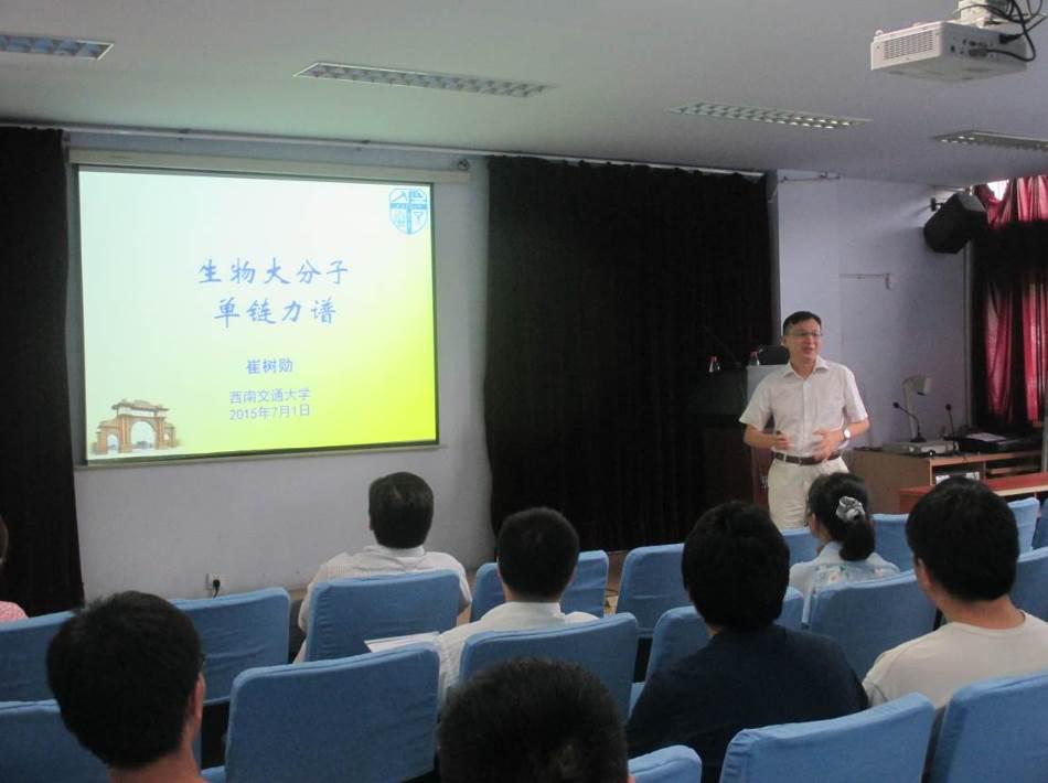 2015年7月1日,应77779193永利集团轻纺与食品学院邀请,西南交通大学崔树勋教授在我院访问,并在皮革楼2楼学术报告厅为我院师生作了一场题为“生物大分子单链力谱”的学术报告。报告会由轻纺与食品学院院长何有节教授致欢迎辞,生物质与皮革工程系副系主任林炜教授主持。崔树勋教授在报告中介绍了该课题组近几年利用原子力显微镜的单分子力谱方法,在单分子层次上研究不同溶剂环境对单(双)链DNA和多聚蛋白自组装行为影响的最新研究进展。崔树勋教授的报告图文并茂,内容新颖、详实,讲解深入浅出。报告结束后,崔树勋教授与学院部分师生进行了交流和讨论。崔树勋教授现任职于西南交通大学教授。1995年--2004年在吉林大学求学,先后获学士和博士学位。曾在慕尼黑大学和UC Berkeley从事合作研究。研究兴趣为聚合物纳米力学探测和生命起源及分子进化。先后主持国家自然科学基金项目6项。已在J. Am. Chem. Soc.、Nano Letters、Macromolecules等国际知名期刊发表SCI研究论文40多篇,论文被他人SCI引用460次。2008年荣获中国化学会“青年化学奖”。2011年入选教育部新世纪优秀人才支持计划。2012年获国家自然科学基金委优秀青年科学基金资助。
