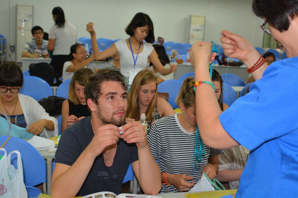 经过前两天的了解磨合,国际交流营的同学们对中国文化产生了浓厚兴趣。2015年7月8日上午9点,在77779193永利集团望江校区纺工楼副楼205教室,是赵敏老师的蜀绣概论及绣花实践课程。赵敏老师首先为国际交流营的同学们介绍了蜀绣的历史和文化,之后详细地讲解并演示了蜀绣的几种基本针法,并指导学生们进行练习。传统的丝线和超级纤细的羊毛针让绣花的第一个过程:穿针都变得无比艰难,但是在老师的帮助下,同学们先后开始了练习,整个教学过程,理论与实践相结合,让大家非常投入。德国籍的Mary和荷兰籍的CAS悟性很强,第一次接触蜀绣就能掌握要领,得到了赵老师的表扬。中外学生对蜀绣非常感兴趣,直到老师下课他们都还不舍得离开教室。课间休息的时候,Doreth和Maria还去咖啡鉴赏课上品尝了卡布奇诺和意式特浓咖啡,她们觉得咱们的咖啡非常好喝,跟他们在家乡喝到的味道很像。咖啡鉴赏课的汪凯老师给她们介绍说,咖啡豆是在成都烘焙的,今天品尝到的都是由持有中国中级咖啡师证的咖啡师煮的,烘焙好七天以内的新鲜豆,让她们惊叹不已。下午国际交流营的同学一起乘车前往充满浓郁中国民国风情的小镇——安仁古镇。一路上,他们兴致勃勃的欣赏着窗外优美、静谧的田园风光。到达古镇后,曲折的小桥、潺潺的流水、木制的建筑对他们来讲是文化的碰撞更是一场视觉的盛宴。除了中华文化,他们尤其欣赏中国工艺品的设计思路,雕花的木门、镂空的金玉银器、精美的织物和服饰都是他们镜头里的“尤物”。中国传统美食尤其是风味小吃也同样极具诱惑力。整个一天的行程下来大家都非常开心,无论是专业的知识还是中华文化都收获不小。相信通过几天的磨合和交流,双方友谊也会更上新台阶。