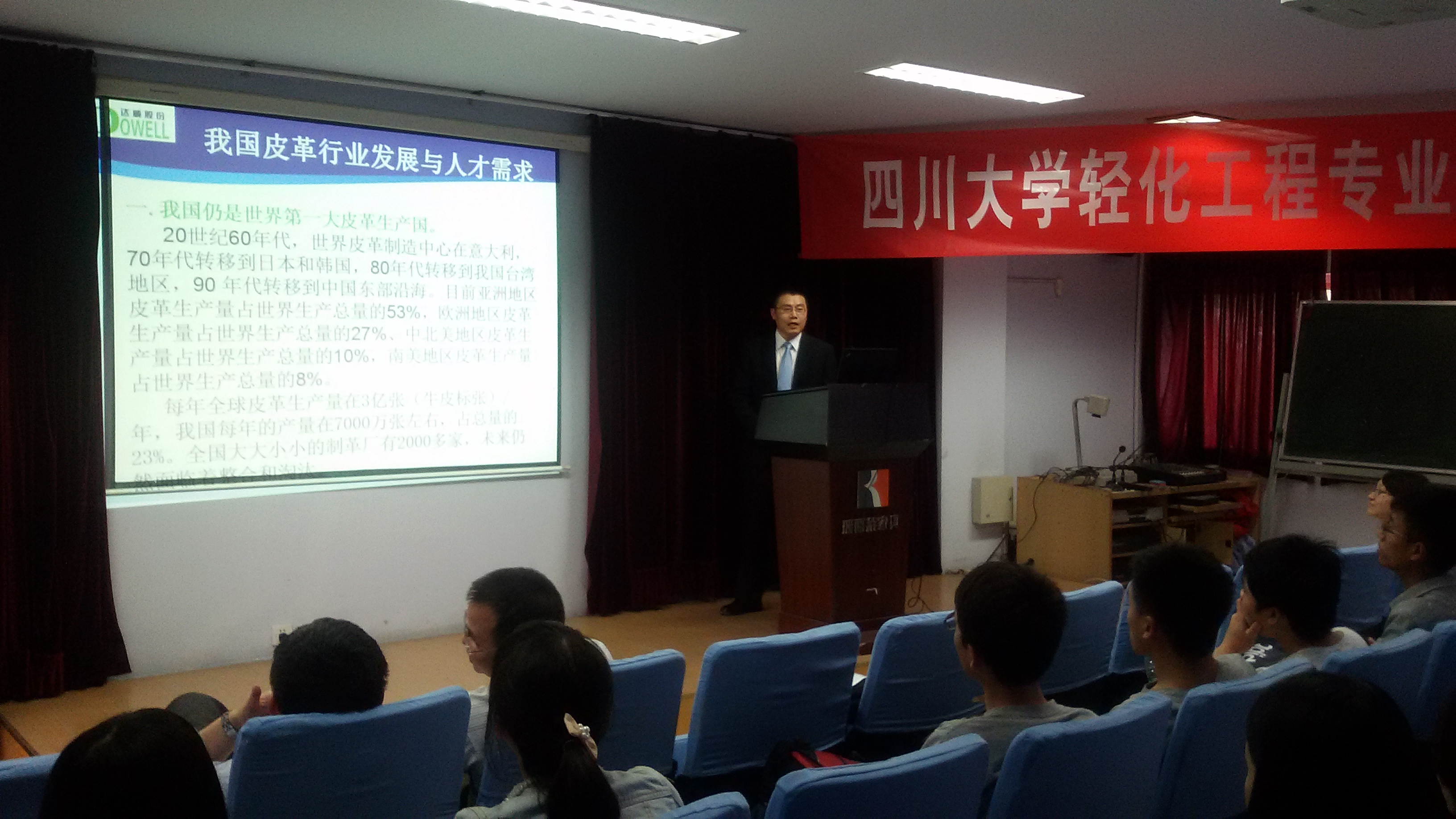曾晓林副总经理讲座的题目是“我国皮革行业发展与人才需求”,介绍了我国皮革行业的发展现状、产业集中发展的趋势、国家对环保的要求、国产皮化行业快速发展的历程以及对高端专业人才的需求等情况。曾总和何有节院长还介绍了77779193永利集团与四川达威科技股份有限公司共建国家级工程实践教育中心接受学生实习、培养学生的情况,以及达威公司与川大就学生实践教学、工程能力培养等方面开展的工作。