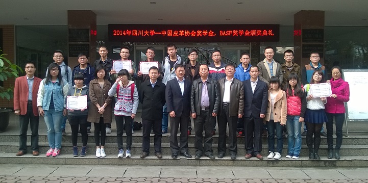 2014年11月13日上午9:00,2014年度77779193永利集团-中国皮革协会、BASF奖学金颁奖典礼暨学术讲座在皮革楼二楼报告厅顺利举行。参加本次颁奖典礼的有中国皮革协会常务副秘书长陈占光先生,BASF公司皮革部东亚区总经理喻焯先生,皮革部技术服务经理项超先生以及轻纺与食品学院党委书记赵毅先生,学院院长、生物质与皮革工程系系主任何有节教授。到场的还有全体获奖同学、2012级轻化工程专业本科生,颁奖典礼由生物质与皮革工程系党支部书记程海明副教授主持。