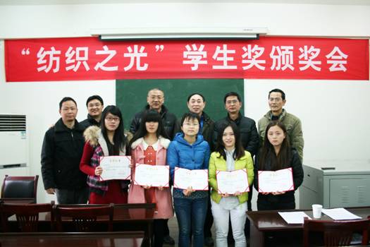 2013年度“纺织之光”学生奖获奖同学及院系领导合影