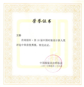 我院研究生王盼荣获第18届“绮丽杯”新人奖服装设计大赛优秀奖