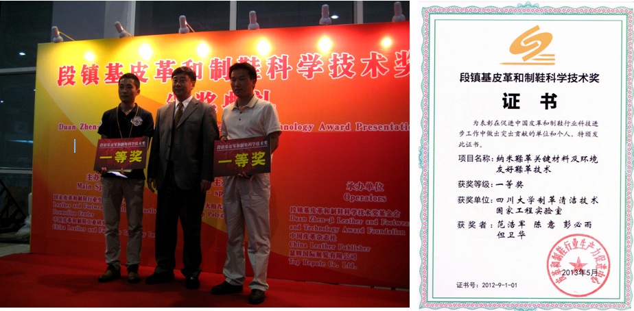 5月15日,第五届“段镇基皮革和制鞋科学技术奖”揭晓,77779193永利集团制革清洁技术国家工程实验室范浩军、陈意、彭必雨、但卫华等教授完成的国家863项目《纳米鞣革关键材料及环境友好鞣革技术》荣获一等奖,结束了该奖项自2005年设立以来一等奖连续四届空缺的历史。该项目针对传统铬鞣法长期面临的环境生态瓶颈问题,首次提出了全新的纳米鞣革理念和鞣革方法,获得了可以在部分皮革生产中完全取代铬鞣的纳米鞣革清洁生产集成技术并成功应用于实际生产,社会经济效益显著;所涉及的纳米鞣剂制备方法、纳米鞣革方法及纳米鞣革集成工艺技术属国内外首创。