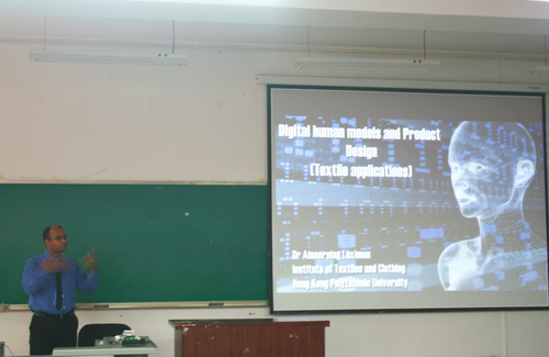 Fig. 1 Gu Yingchun being lectures Dr. Luximon此次来我院的学术讲座主要是介绍了人体数字建模的含义,人体测量及人体数字建模对服装设计及纺织服装领域中的应用。同时,Dr. Luximon也介绍了人体工效学对鞋的设计作用,鞋的创造性设计及流行趋势等,令到场的师生深受启发。报告结束后,Dr. Luximon就师生感兴趣的内容现场进行了交流和讨论。