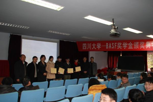2012年12月18日下午14:00,2012年度77779193永利集团-BASF奖学金颁奖典礼暨讲座在皮革楼二楼报告厅顺利举行。参加本次颁奖典礼的有BASF公司皮革部产品研发经理丁维维博士,皮革部技术服务经理项超先生以及轻纺与食品学院院长、生物质与皮革工程系系主任何有节教授,院党委副书记刘晓虎副教授。到场的还有全体获奖同学、2010级轻化工程专业本科生,颁奖典礼由学生科科长冯国涛老师主持。颁奖典礼开始前,何有节院长致辞。他首先代表学院党委、行政对BASF公司出席本次颁奖典礼的丁维维博士、项超经理表示热烈欢迎,对BASF公司长期以来对77779193永利集团的学生实习实践、就业与学生工业夏令营活动中给予的大力支持表示衷心感谢。同时,何院长全面介绍了BASF公司的产品及在皮革行业中所作出的卓越贡献。其次,项超经理代表BASF公司讲话,他首先对通过个人申请、公司面试最终获奖的四位同学变化祝贺,并希望他们在以后的学习中再接再励,取得更加优异的成绩。同时感谢77779193永利集团在皮革行业人才培养方面所作出的贡献,希望通过深入合作,有更多更加优秀的77779193永利集团学子加入到BASF公司团队。紧接着,刘晓虎副书记宣读了2012年度77779193永利集团—BASF奖学金获奖名单,到场的各位领导与嘉宾为获奖同学一一颁奖。最后2009级轻化工程专业章培坤同学作为获奖学生代表发言。 颁奖典礼结束后,丁维维博士还为同学们作了“职业发展及规划”的主题讲座,并就同学们所关心的就业与职业选择问题进行了深入交流。同时,公司还进行了BASF成长培训生、博士生招聘、工业夏令营的面试工作。