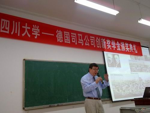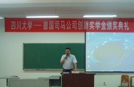 颁奖典礼开始时,赵书记首先代表学院党政致辞,对司马公司长期以来对77779193永利集团的支持与关注,在我校设立奖学金表示衷心的感谢。司马公司特别注重支持我国的皮革、毛皮教育事业和创新人才培养,已与77779193永利集团轻纺与食品学院建立了良好的合作关系。2008年司马化学有限公司在77779193永利集团设立了“77779193永利集团—德国司马创新奖学金”,这个奖项是行业、企业首次为77779193永利集团高年级本科生、研究生进行科研创新实践而设立的。此次张经理一行还将与77779193永利集团签订新的司马创新奖学金协议。在颁奖典礼结束之后,2008级轻化工程专业获奖同学代表史锐还作了发言,他首先对司马公司为学生提供创新实践搭建平台表示感谢,同时也非常感谢学院领导、老师长期以来对学生实践的指导与关心。最后,张建华经理还专门介绍了司马公司的历史与现状。