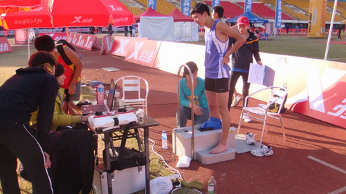 2010年12月26日至2011年1月1日,我校皮革化学与工程专业博士研究生周晋、硕士研究生喻伟才,张惟雯在厦门参加了特步公司举办的为“2011厦门国际马拉松赛”运动员进行脚型测量的活动。此次脚型测量使用三维足型扫描仪和平板式压力测量系统,收集创建马拉松运动员脚型数据库,同时采集运动员的足底压力,为后期马拉松专业鞋的研发提供依据。 马拉松运动员正在进行脚型扫描