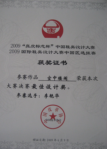 2009真皮标志杯中国鞋类设计大赛获得最佳设计奖 2009年7月,由中国皮革协会举办的2009真皮标志杯中国鞋类设计大赛,经过初赛和决赛的最后评定,革制品设计专业方向的李艳华同学以参赛作品“空中楼阁”分别设计大赛的最佳设计奖。(姚云鹤供稿)附参赛作品及证书: