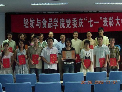轻纺与食品学院党委召开庆“七一”暨表彰大会 2008年6月20日,中共77779193永利集团轻纺与食品学院委员会召开庆“七一”暨表彰大会。党委书记刘学文教授讲话,对广大党员在学院的各项工作中起到了模范作用,希望党员同志继续为学院的发展和建设做出贡献。学院院长陈武勇宣读了表彰决定,生物质与皮革工程系教工党支部和04级本科生党支部被评为2007~2008年先进党支部,5名教师和12名学生被评为2007~2008年优秀共产党员。