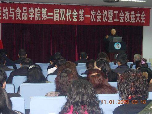 轻纺与食品学院第二届双代会第一次会议及工会改选大会胜利召开 2008年1月11日,轻纺与食品学院召开了第二届双代会第一次会议及工会改选大会,学校工会主席蒋润书,副主席蒙慧玲、唐宏光,民主建设科科长黄伟参加了会议。校工会主席蒋润书代表学校工会祝贺我院双代会的召开,肯定了我院工会工作和创建“教职工之家”的成绩,并对今后工会工作提出了几点建议。 学院党委书记刘学文代表学院党委致辞,祝大会圆满成功。全体代表认真听取和审议了院长陈武勇的学院工作报告和财经工作报告,院工会主席华坚的双代会报告,并分组讨论了以上三个报告,认为报告实事求是,客观全面,并一致通过。希望工会在民主建设、民主监督、民主管理等方面充分发挥作用,为实现我院 “在校内率先建成国内一流、国际知名的研究型学院”和实现学科再创辉煌的目标做出贡献。 会议还选举产生了新一届的院工会委员会。