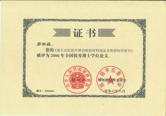 我院石碧教授指导的廖学品博士论文“基于皮胶原纤维的吸附材料制备及吸附特性研究”被评为2006年全国百篇优秀博士论文。该论文创造性的以皮胶原纤维为基础材料,制备出了两类具有重要应用前景的新型吸附材料,分别用于中草药制剂中单宁的高选择性脱除和水体中有毒重金属离子的去除。研究工作拓展了皮革化学与工程学科的研究方向,为皮胶原这一丰富的可再生资源的开发利用提供了新的方法,得到国际同行的认可。在博士论文研究期间发表SCI收录论文11篇,获得国家发明专利2项。