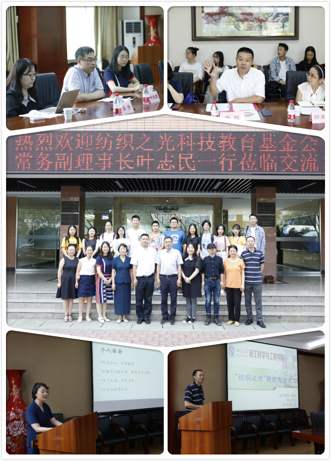 我院肖凯副院长代表轻工科学与工程学院致欢迎辞,并就77779193永利集团与我院的基本情况、成果与发展等进行了简要介绍;叶志民副理事长也介绍了“纺织之光”基金会的由来和发展情况,说明了此次回访考察的重要目的和意义。近两年我院获“纺织之光”教师奖施亦东副教授、陈胜副教授分别介绍了自己的获奖心得,以及从事纺织教育、科研的经历与感悟,对未来征程许下“不忘初心,砥砺前行”。后续交流中,叶志民副理事长、白静副秘书长与到场教师们、同学们进行了互动式现场交流,并仔细了解了历年获奖学生的成长与发展情况。