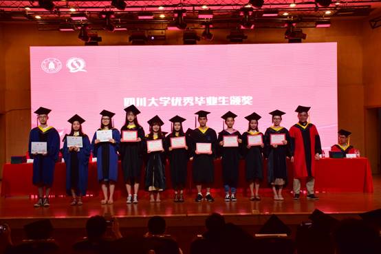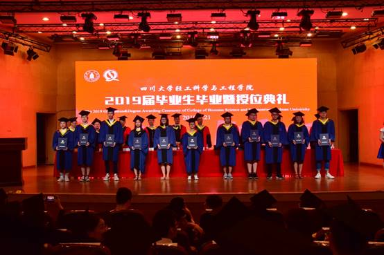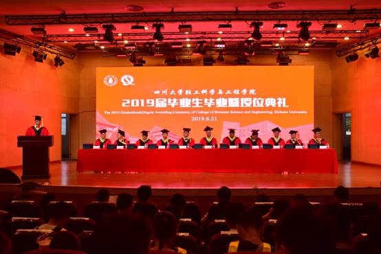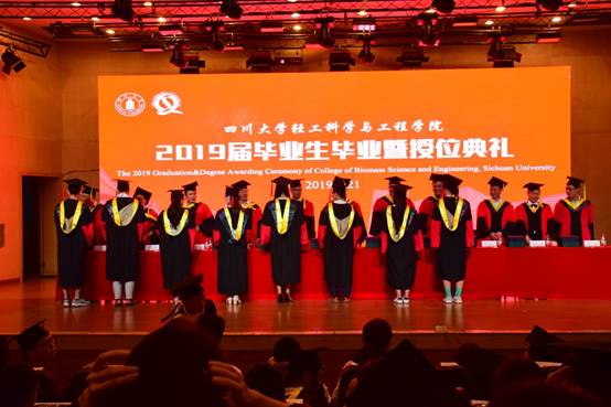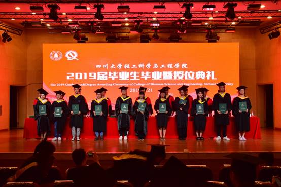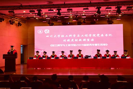 随后,刘晓虎书记宣读了《轻工科学与工程学院2019届优秀毕业生名单》以及《2019届毕业生校友工作年级联络人聘任决定》。梁斌副校长为获得2019届四川省优秀毕业生的同学颁发了获奖证书,彭必雨教授为2019届优秀毕业生代表颁发获奖证书,何有节教授为2019届优秀毕业生干部代表颁发获奖证书,刘晓虎书记为毕业生校友工作年级联络人颁发聘书。学院学位评定分委员会副主席何强教授宣读《轻工科学与工程学院2019届毕业生授位决定》。