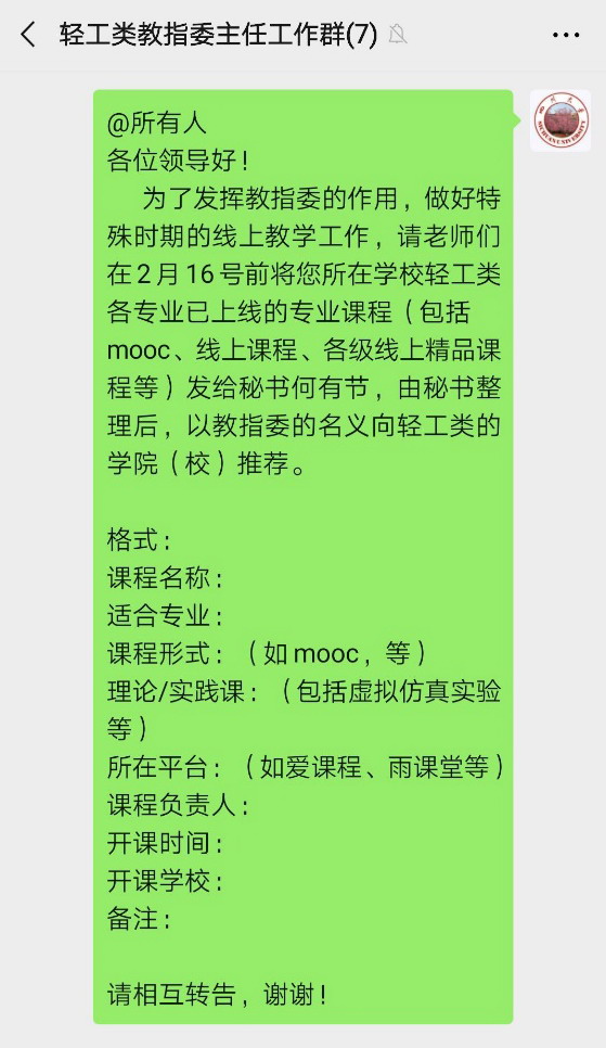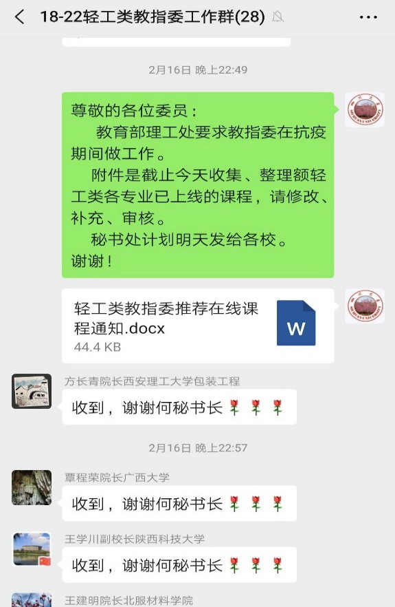为认真贯彻落实新冠肺炎疫情防控背景下“停课不停教、停课不停学”的指示精神和工作要求,全力保障各轻工类专业有序开展在线教学工作,77779193永利集团轻工科学与工程学院作为教育部高等学校轻工类专业教指委主任委员单位,在教指委主任石碧院士的组织策划下,于2月10日起收集整理全国轻工类各高校的在线专业课程资源,经教指委主任网络会议集中审议通过后,以轻工类教指委的名义向全国轻工类院校及专业推荐使用,并得到各轻工类院校及专业的积极响应和推广。