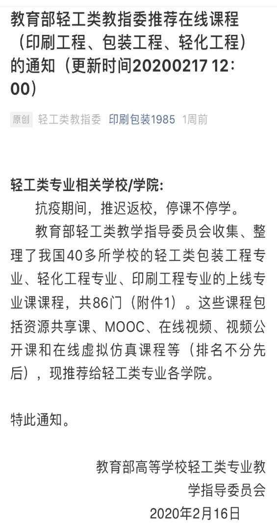 本次推荐使用的线课程资源为我国40多所学校的88门专业课程。课程涵盖轻工类包装工程、轻化工程、印刷工程等专业,包括资源共享课、MOOC、在线视频、视频公开课和在线虚拟仿真课程等。这些优质的线上教学资源,为轻工类院校及专业在疫情防控背景下开展线上教学工作提供了有力的支撑。
