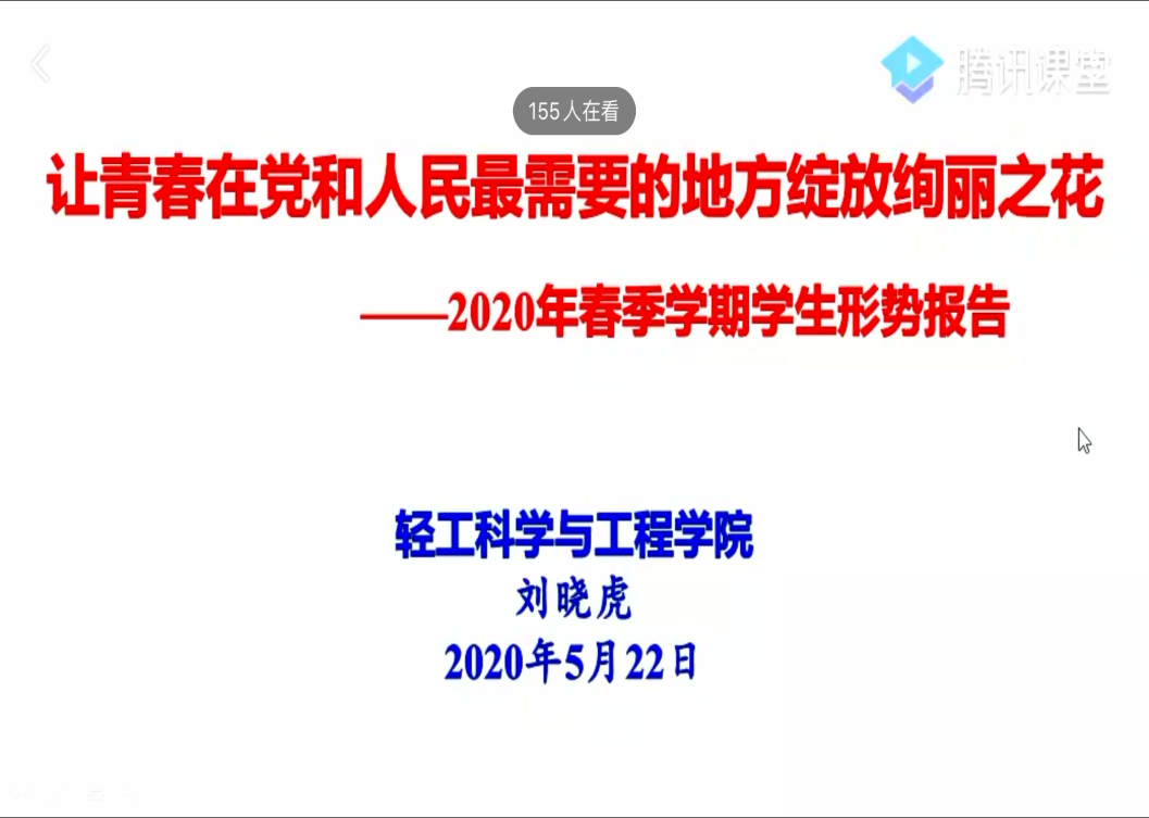 2020年5月22日,按照学院关于书记、院长为学生上思想政治理论课的工作安排,党委书记刘晓虎副教授与2017级本科生云端相聚,主讲题为“让青春在党和人民最需要的地方绽放绚丽之花”的网络云党课。学院党委副书记、2017级辅导员冯国涛老师与2017级全体同学参加了此次课程学习。