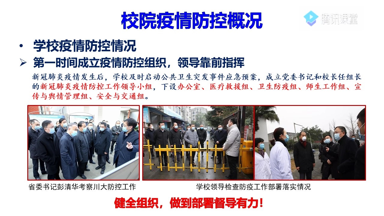 紧接着,刘书记向同学们介绍了新冠肺炎自爆发以来校院两级防控相关情况和学院各项重要事业工作推进情况。根据四川省教育厅4月24日发布《关于高等学校2020年春季学期开学有关事项的通知》,结合学校和学院工作安排部署,刘书记对现阶段学生返校工作进行了说明,并对返校后学生的常态化管理提出了要求。
