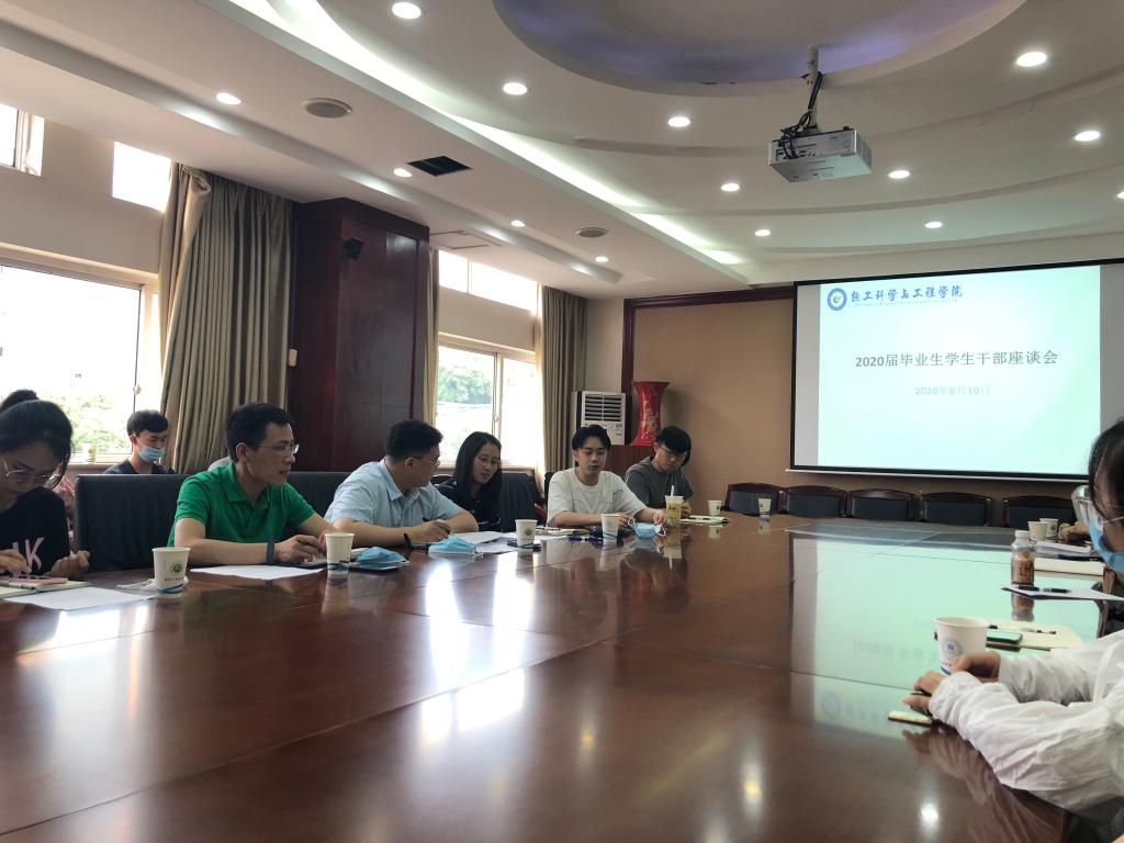 2020年6月10日下午在皮革楼209举行了2020届毕业生干部座谈会。院党委书记刘晓虎副教授、党委副书记冯国涛老师、学生事务办公室主任贺婷老师参加了此次会议。在听取学生干部的交流发言后,刘书记希望学生干部们要保持住年轻人的热情、朝气;保持参与公共事务的想法与热心并保持学生干部的中枢作用以使集体永远凝心聚力。冯国涛副书记希望通过学生干部对学院的管理模式、对党支部、团支部、班级的班风学风的管理建议以促进学院学生工作高效、完善之目的。