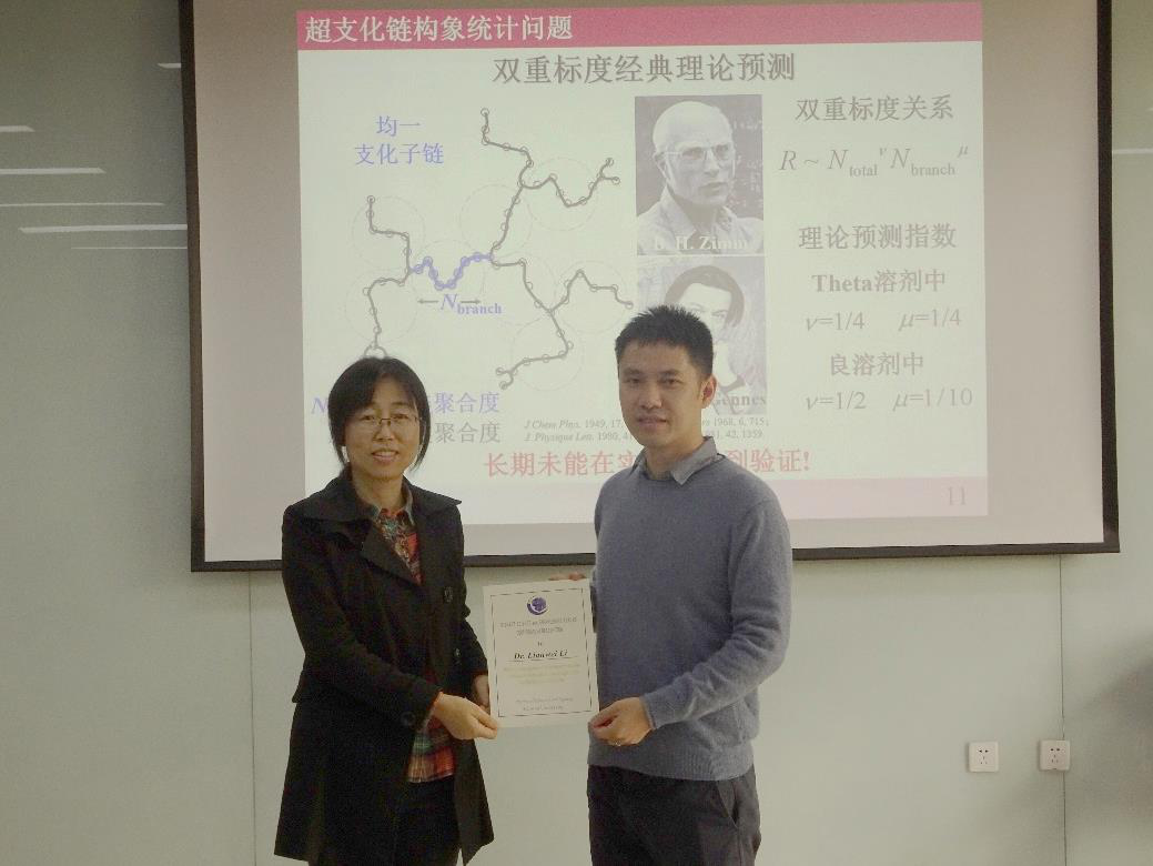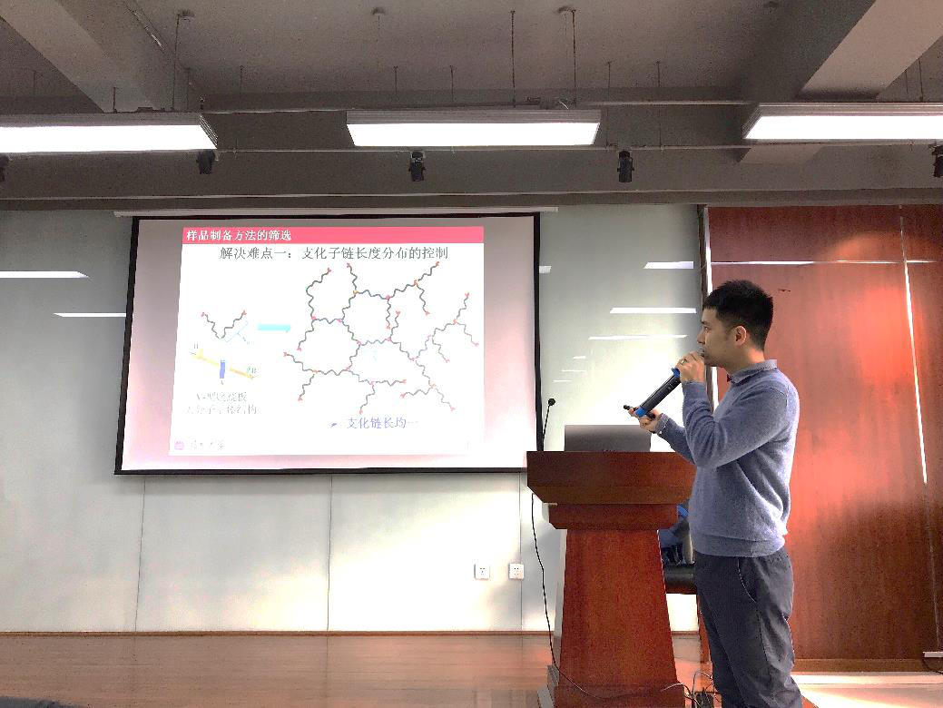李连伟副教授首先介绍了无规超支链的结构特点、分类标准及广泛应用。聚焦于超支化链构象这一经典高分子物理问题,其进一步分析了对前人理论预测结果进行实验验证的症结和难点。通过解决模型支化链结构的筛选和构筑难题,以及实验测量方法学的优化和整合,李连伟副教授课题组在实验上基本回答了关于超支化链构象的核心焦点科学问题。特别地,李连伟副教授介绍了在不同溶剂条件下超支化高分子经典双重标度关系普适性的实验验证结果,并讨论了支化密度和支化图案对诸多链行为的定量影响规律。