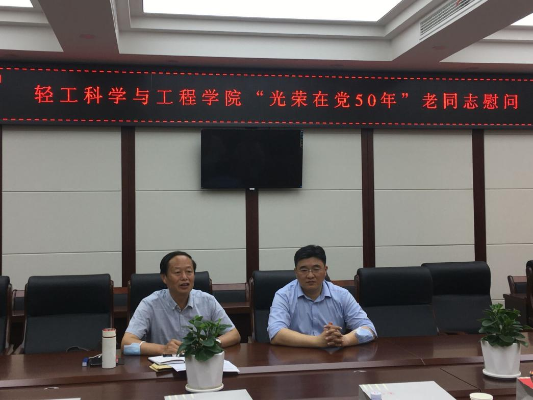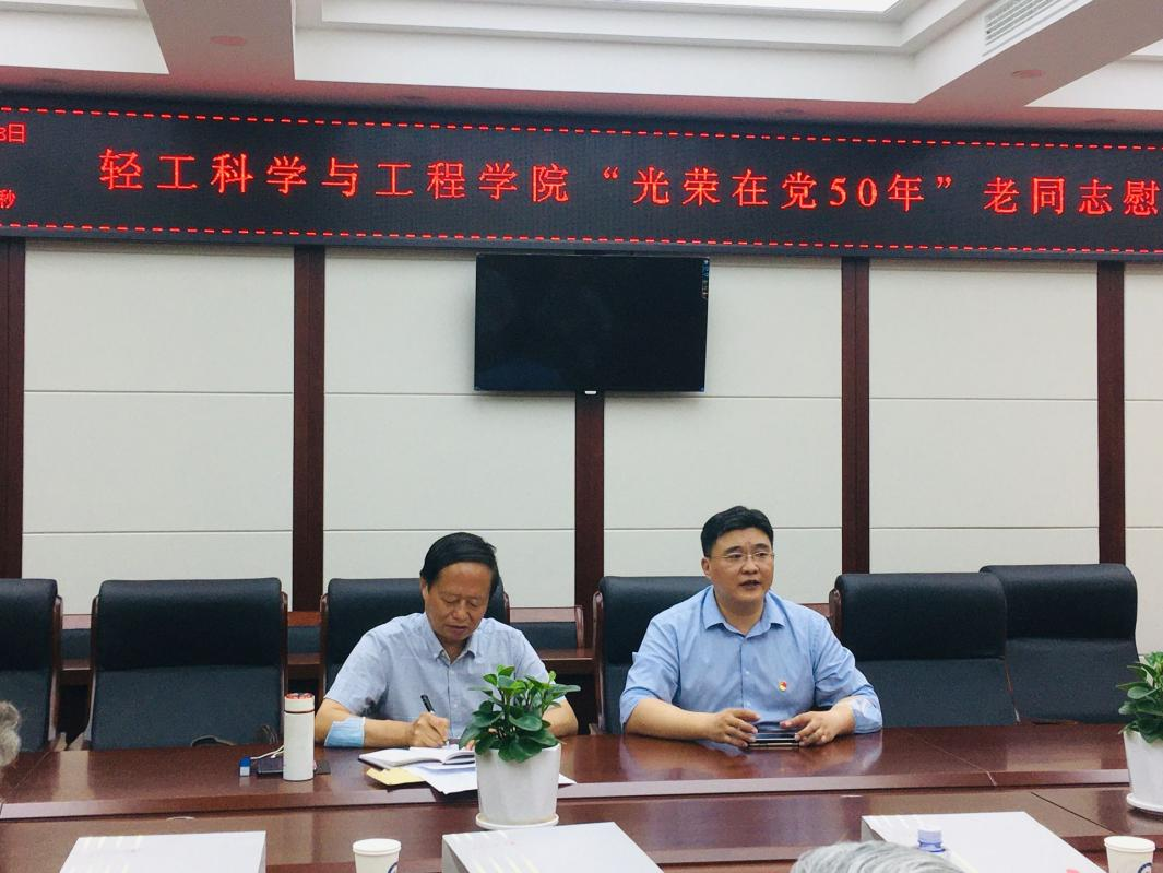 为了从政治上激励、精神上鼓舞广大党员,进一步增强党员的荣誉感、归属感、使命感,党中央决定,2021年首次颁发“光荣在党50年”纪念章。这是中国共产党成立100周年庆祝活动的重要组成部分。轻工科学与工程学院共有9名老党员获得“光荣在党50年”纪念章。2021年6月23日上午,学院在纺工附楼205会议室举行了“光荣在党50年”老同志慰问会,学院党委刘晓虎书记、何有节院长、离退休教工党支部书记李慧老师、部分老同志代表和教工党支部负责人出席会议,会议由刘晓虎书记主持。