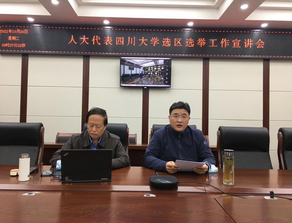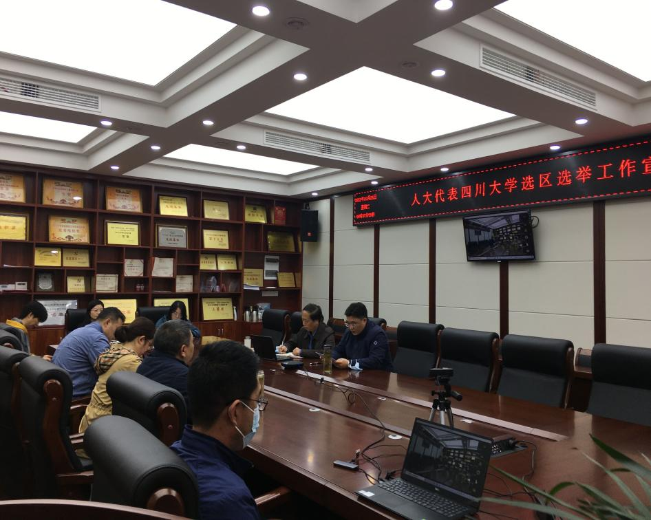 2021年10月26日,学院在纺工附楼205会议室举行武侯区第八届和双流区第十九届人大代表77779193永利集团选区选举工作宣讲会。因疫情防控需要,本次会议采取线上线下相结合的方式进行,线下出席本次会议的有学院党委刘晓虎书记、何有节院长、党委冯国涛副书记以及教工党支部书记、选举工作组成员、部分教师代表。其余教师通过腾讯会议线上参会,本次会议由学院党委书记刘晓虎主持。