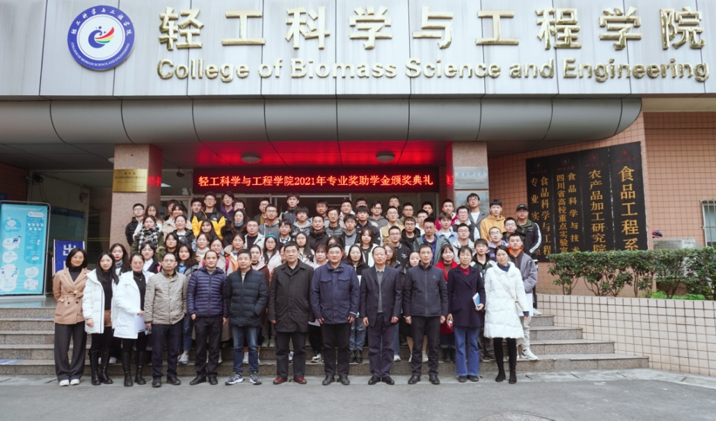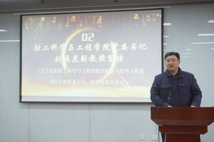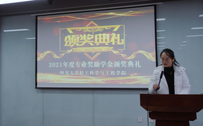 接下来,学院党委书记刘晓虎副教授宣读了《关于表彰轻工科学与工程学院2021年度优秀个人、优秀班级的决定》。在隆重的颁奖音乐中,学院领导为获奖同学代表一一颁奖并合影留念。最后,2019级轻化工程专业创新班学生孙楠同学代表获奖学生发言,他表示在学习阶段对皮革专业了解越多,热爱越深,学院提供了优秀教师资源与超一流实验室,而学生要做的就是把握机会,在入学的这3年里他找到了自己的科研方向、制定了清晰的计划。同时,他也表达了对设奖单位的感谢,对学院老师们的谆谆教导表示谢意。最后他感悟到现如今多学科交叉是大学期间综合能力提升的必然趋势,应积极拓展自我视野和知识面,而学习之路没有捷径,继续深造应是作为川大本科毕业生的首要选择,也是自我前进路上的风景!