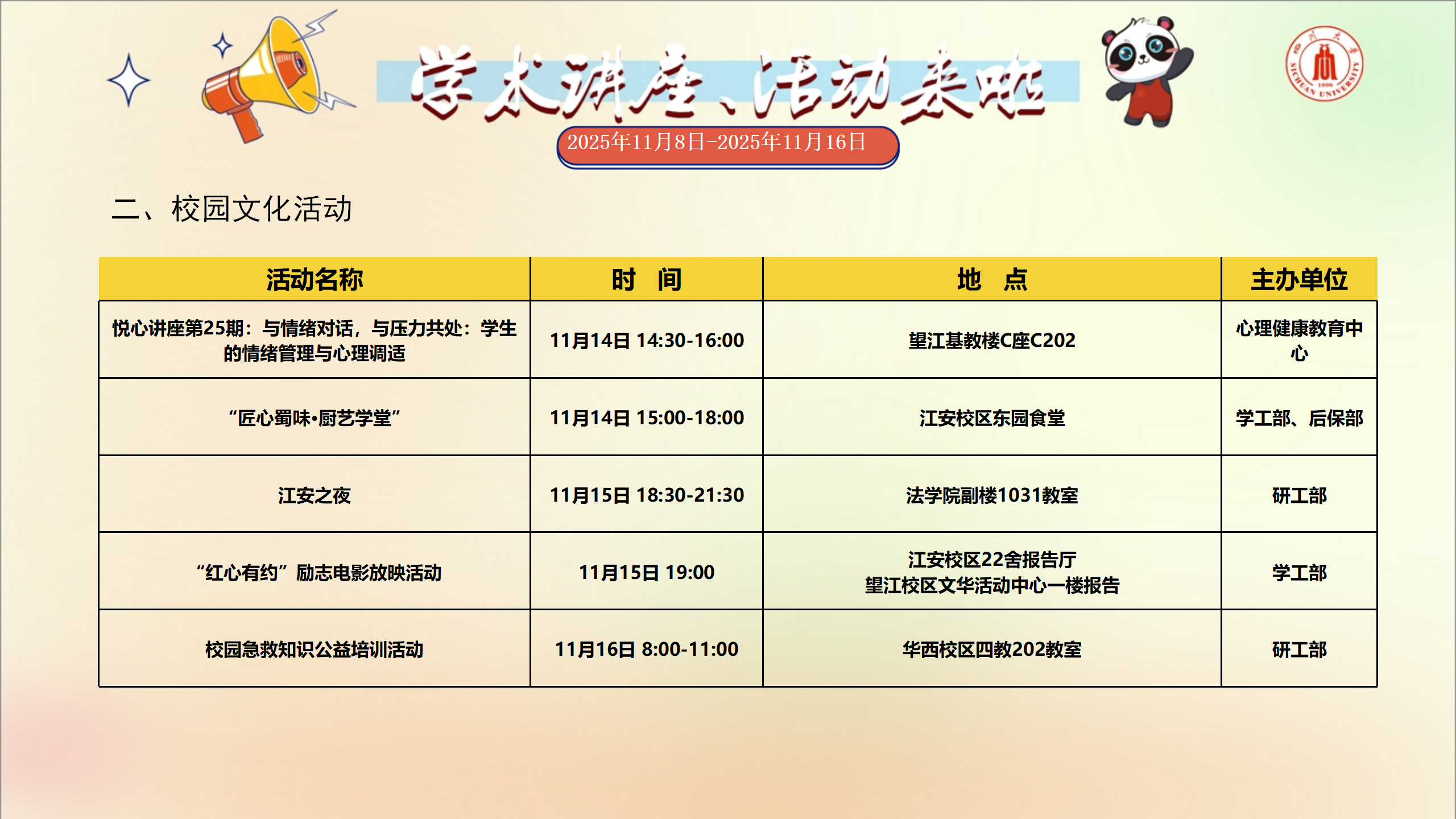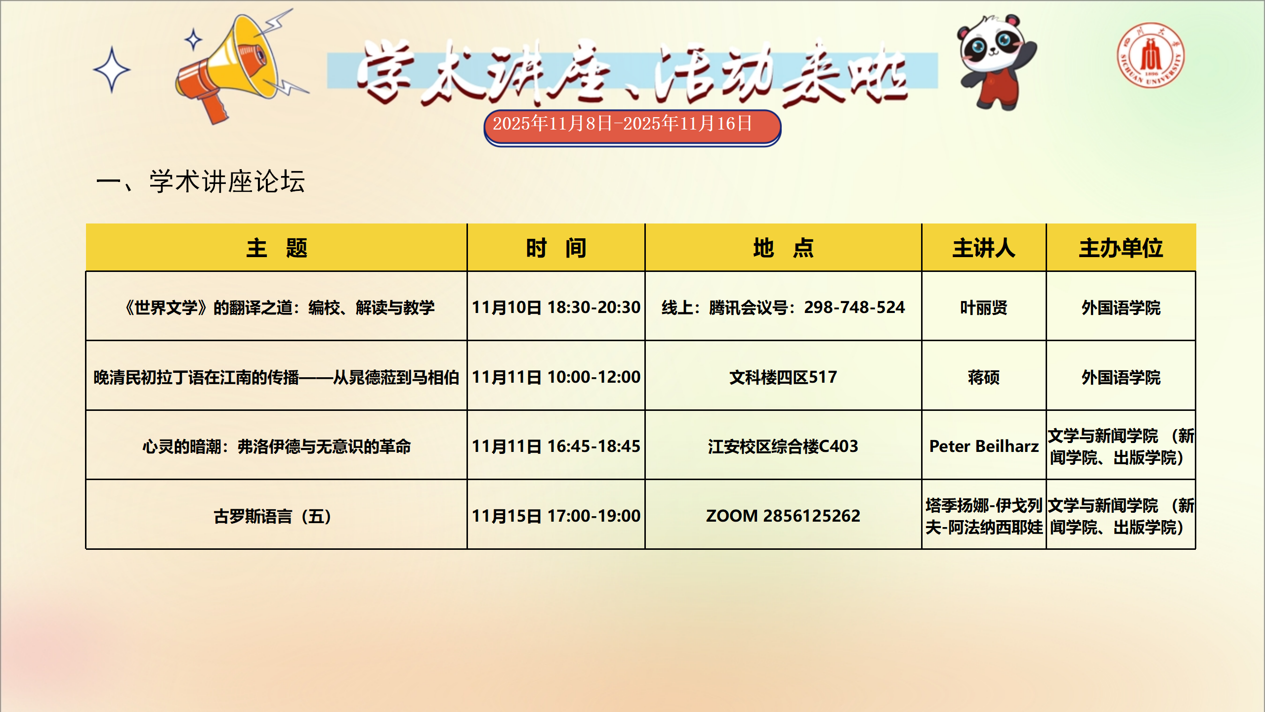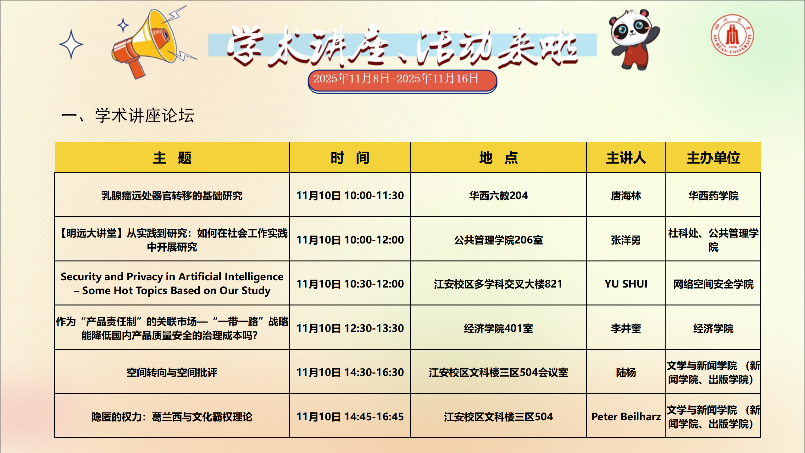 学术讲座和校园文化活动预告(2025年11月8日-2025年11月16日)