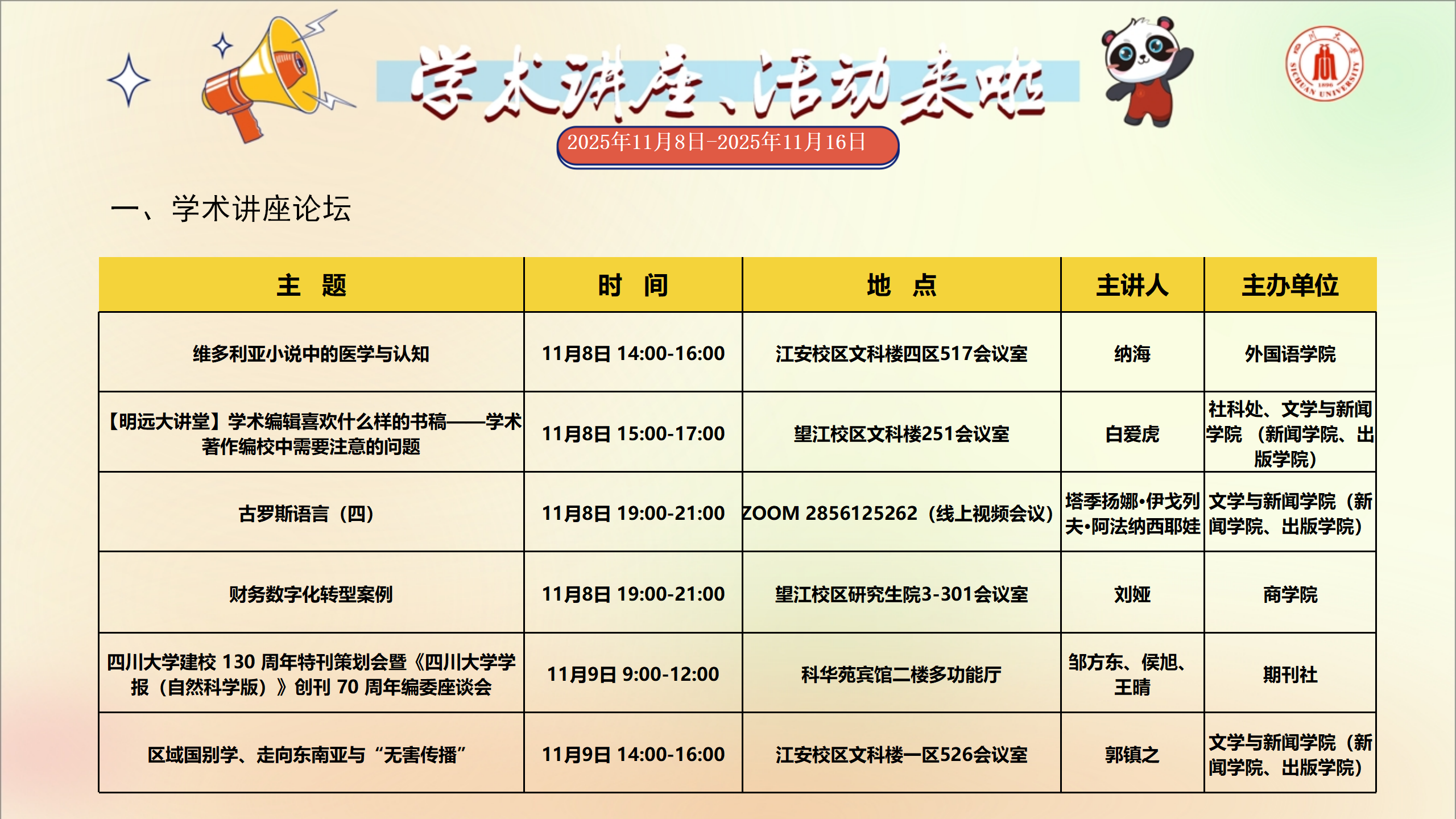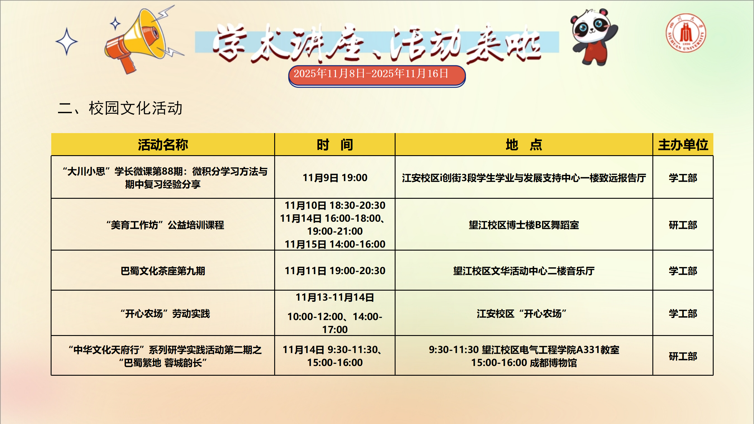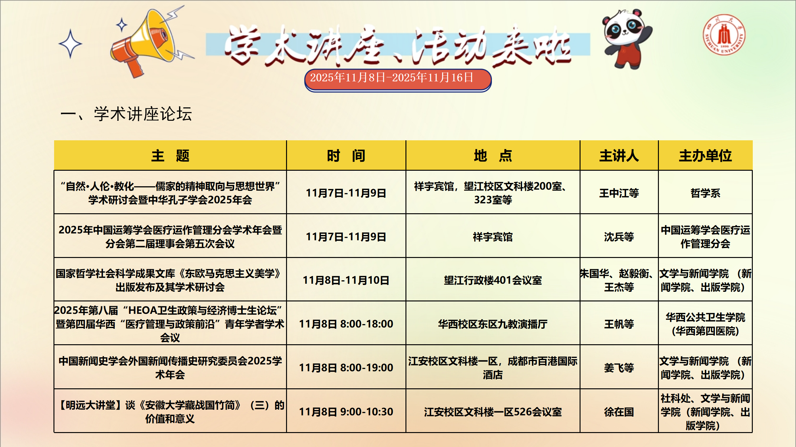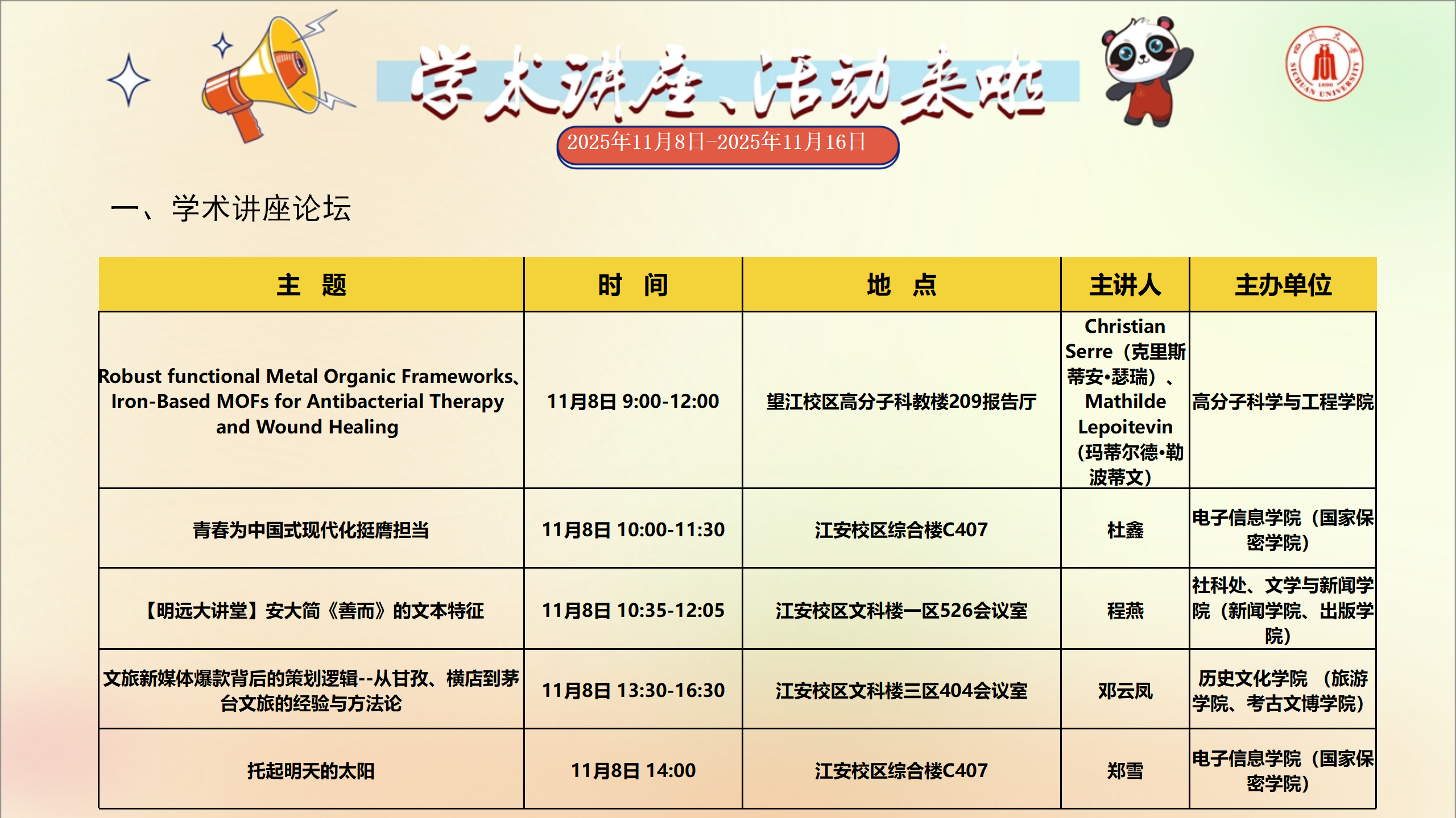 学术讲座和校园文化活动预告(2025年11月8日-2025年11月16日)