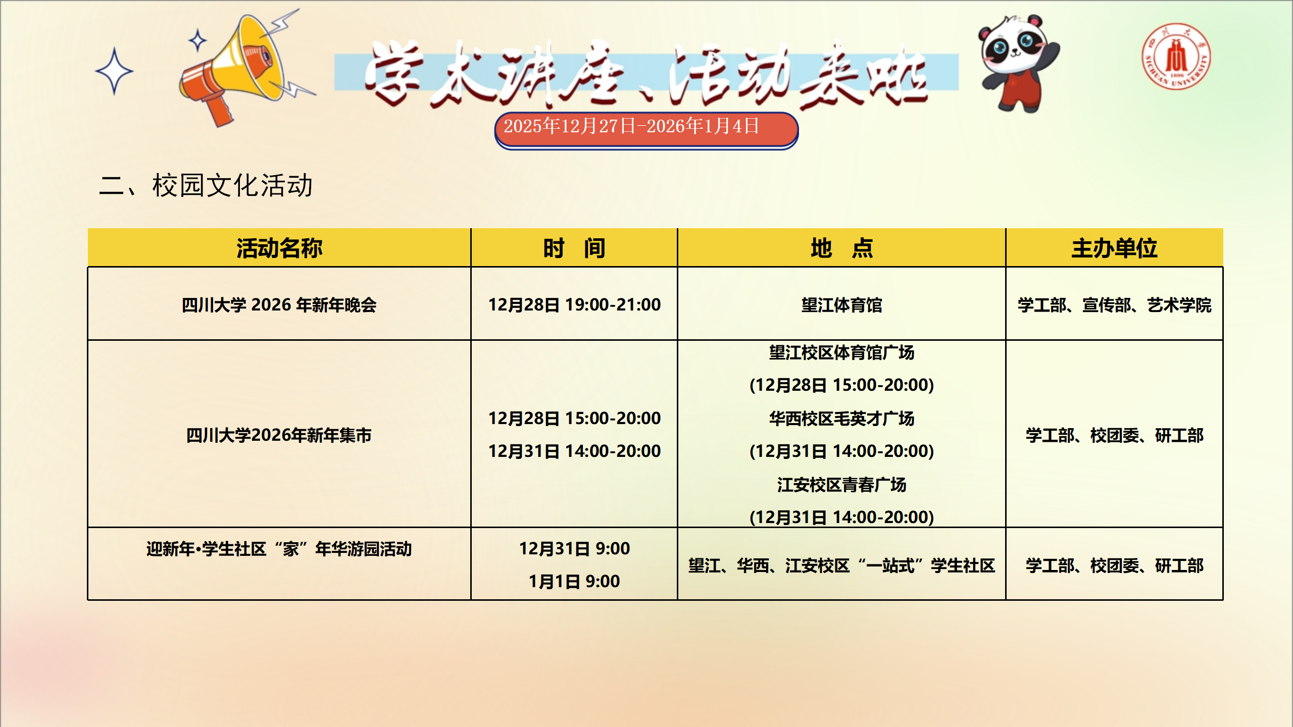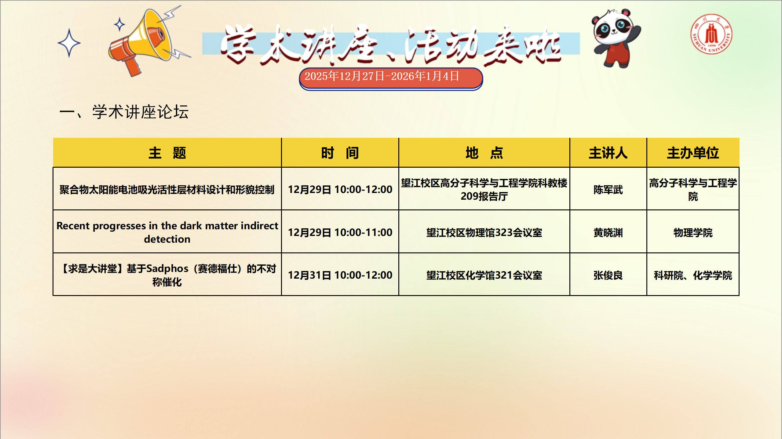 学术讲座和校园文化活动预告(2025年12月27日-2026年1月4日)