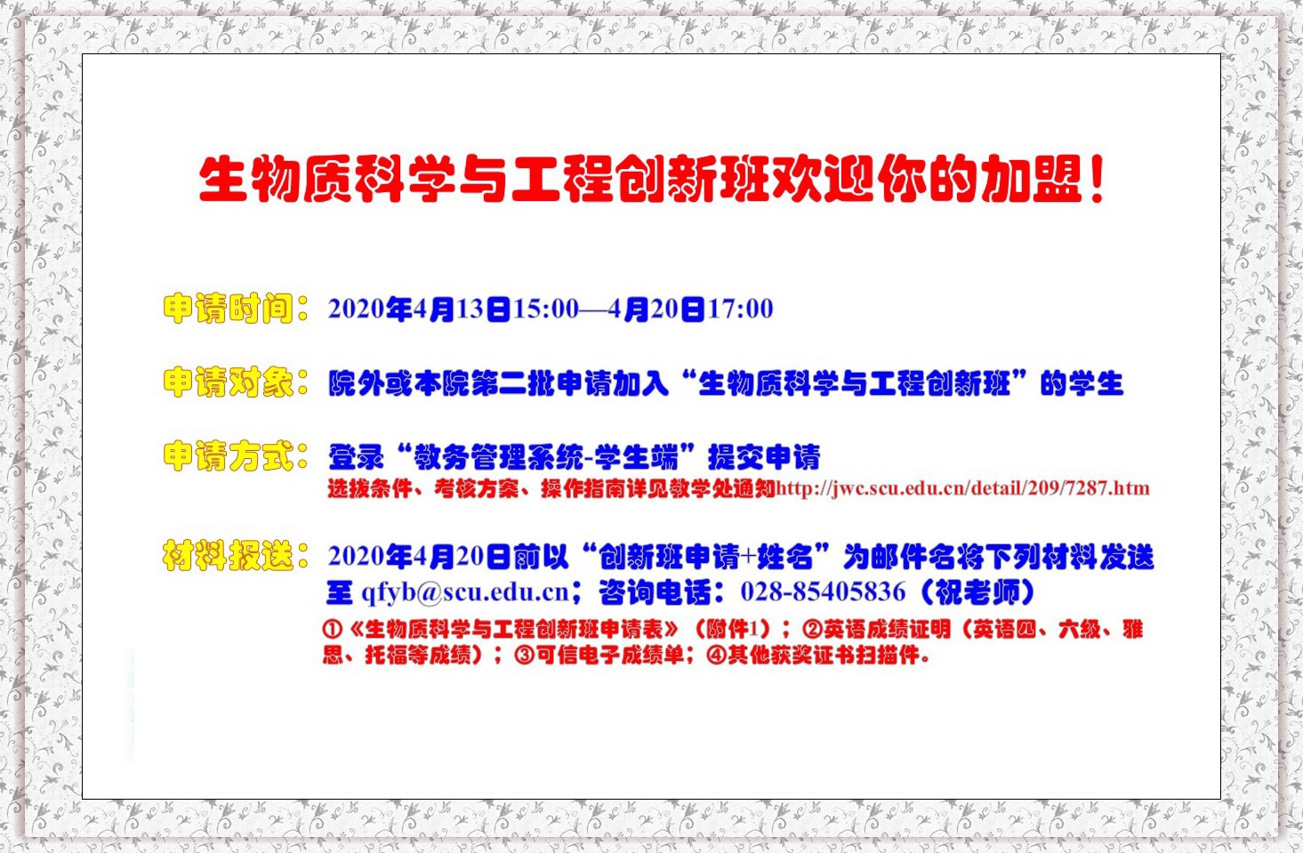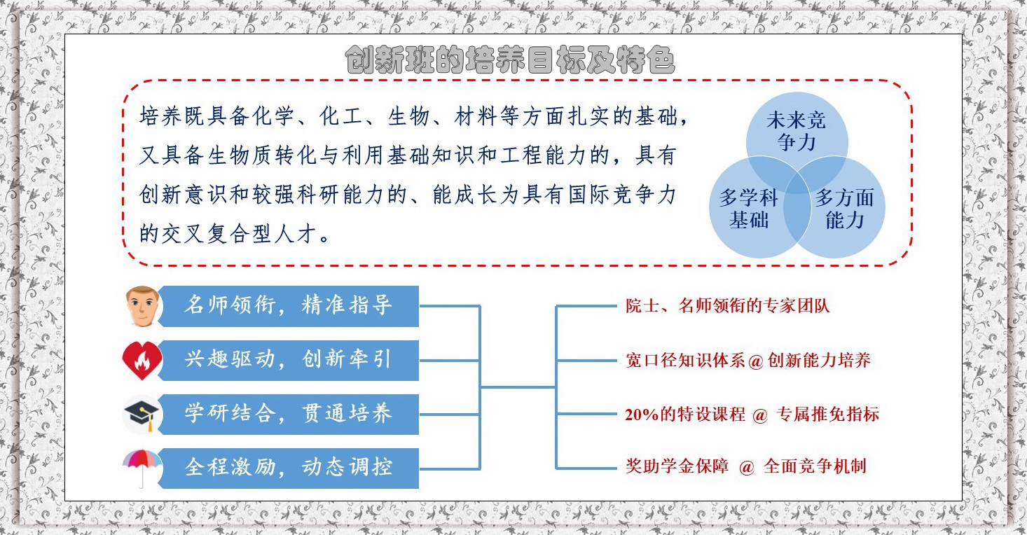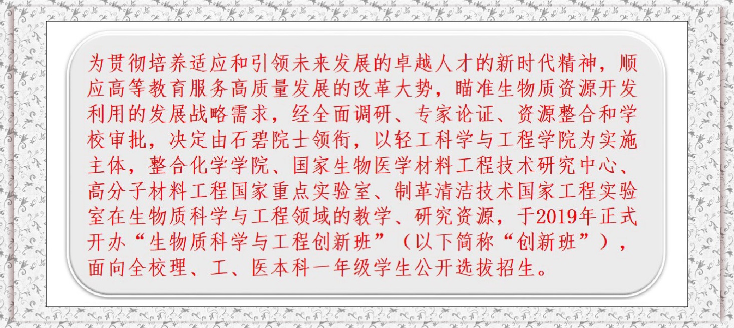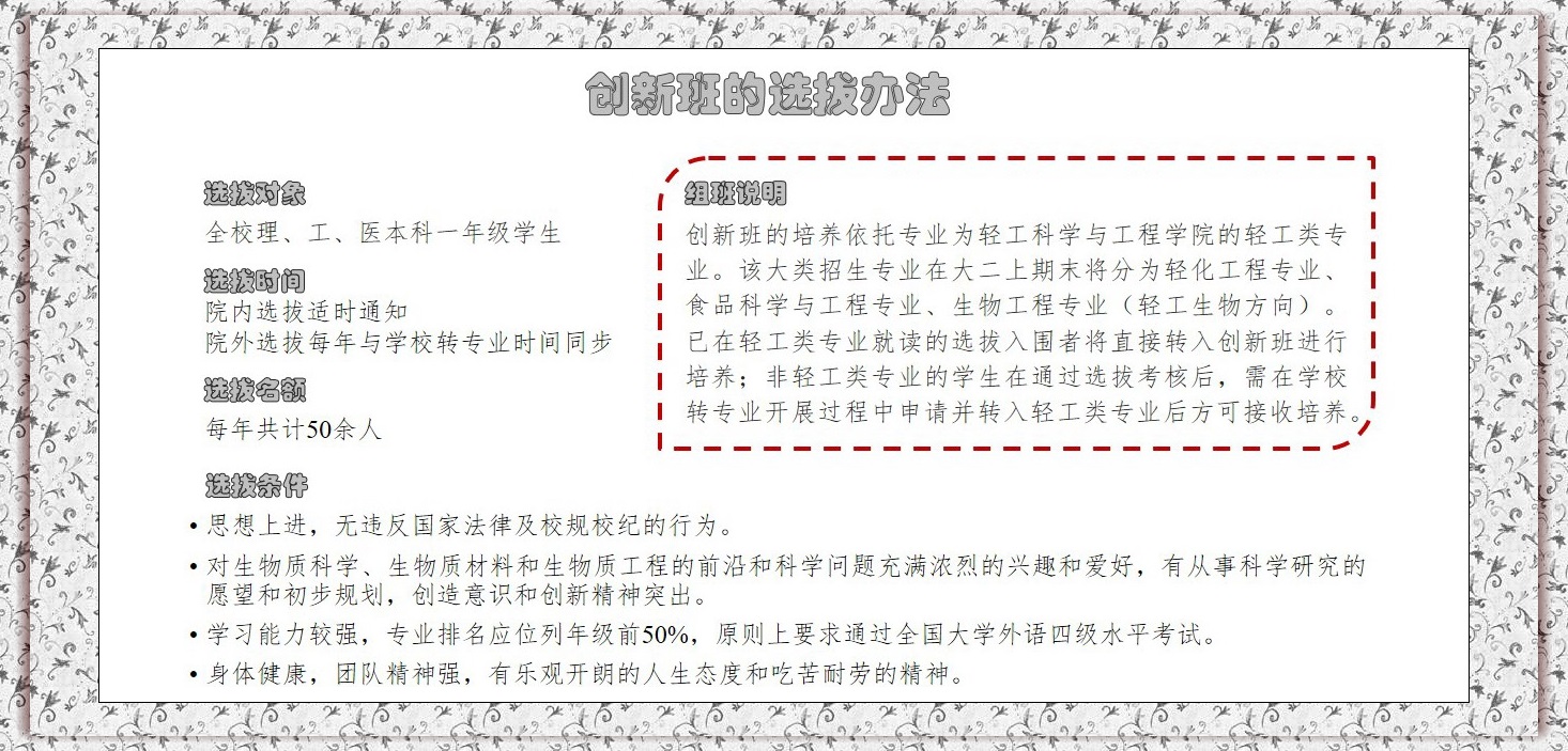一、生物质科学与工程创新班2020年选拔条件、考核方案、操作指南详见教学处通知。(点击去往)