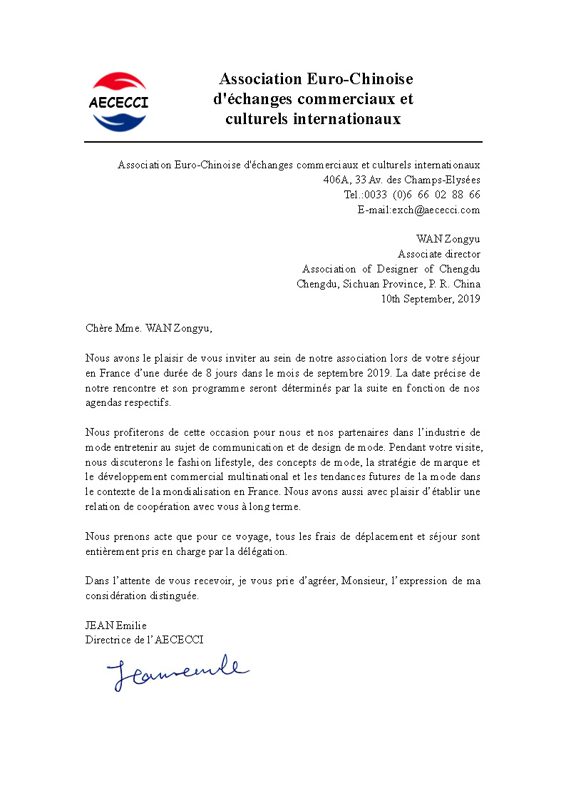 受中欧国际贸易及文化交流协会的邀请,万宗渝老师拟于2019年9月24日-30日赴法国巴黎(日程7天),参与巴黎时装周及相关研讨,经费来源为科研经费,往返路线为:成都-巴黎-成都。