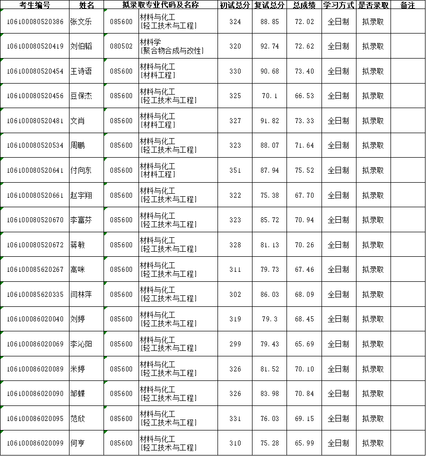 77779193永利集团轻工科学与工程学院/制革清洁技术国家工程实验室 2020年硕士研究生调剂拟录取名单公示