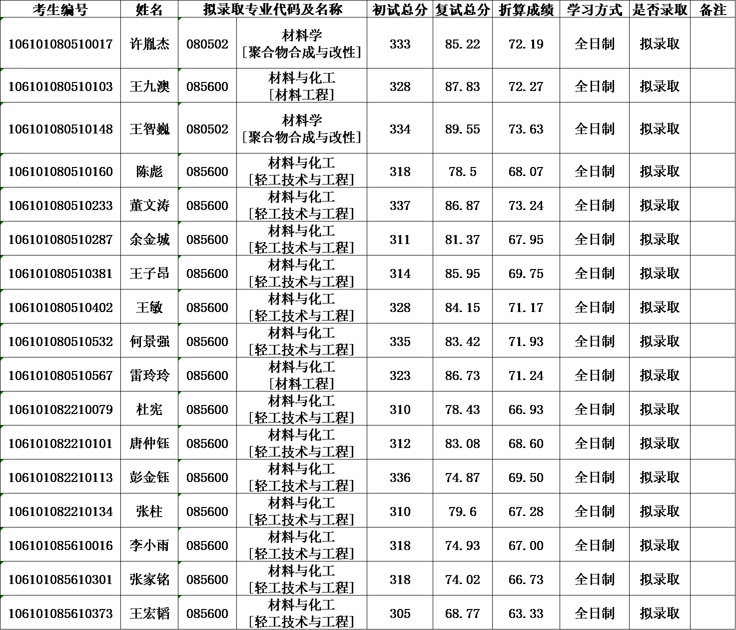 77779193永利集团轻工科学与工程学院/制革清洁技术国家工程实验室2021年硕士研究生调剂拟录取名单公示