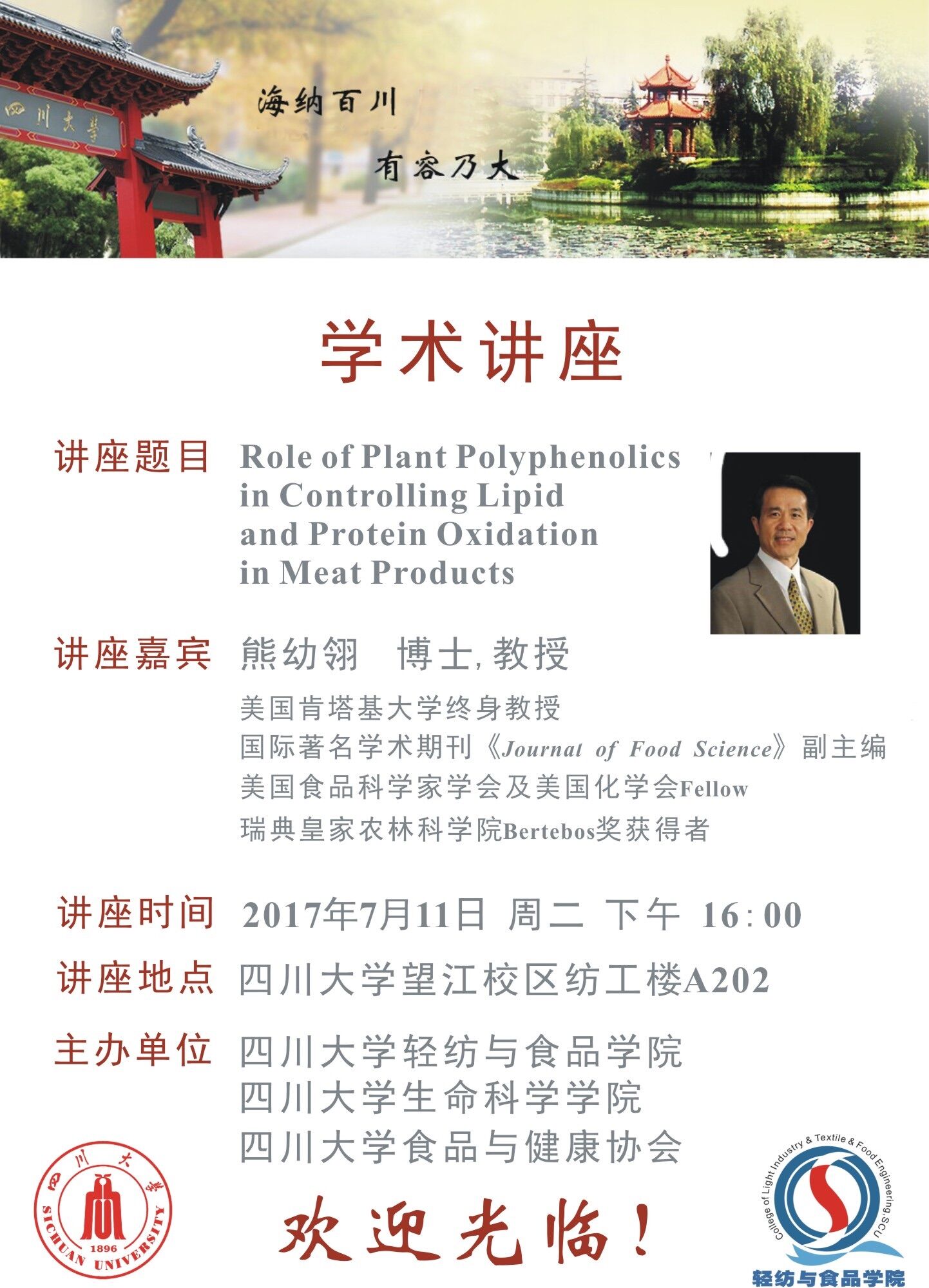 报告题目:Role of Plant Polyphenolics in Controlling Lipid and Protein Oxidation in Meat Products 报告人:美国肯塔基大学熊幼翎博士教授 报告时间:2017年7月11日(星期二)下午16:00 报告地点:77779193永利集团轻纺与食品学院纺工楼A202 报告人简介:熊幼翎博士现为美国肯塔基大学终身教授、美国食品科学家联合会(Institute of Food Technologists)会刊《Journal of Food Science》副主编,江南大学高层次人才,先后获得美国肯塔基大学杰出研究科学家奖、美国肉品科学协会杰出研究奖、杰出成就奖、美国化学会青年科学家奖、瑞典皇家农林科学院Bertebos奖等多项学术奖励。熊幼翎教授在食品科学与营养领域教学和研究二十多年,在食品科学与技术尤其是食品蛋白质化学和肉品加工领域取得了世界领先的开创性成就,完成多项科研项目,发表SCI论文170多篇、会议论文180篇、出版专著4部、参编书章20多篇,是国际知名的食品蛋白质化学家。