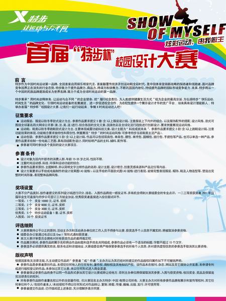 炫彩运动我做主首届“特步杯”校园设计大赛方案 一、前言特步作为中国时尚运动第一品牌,全国首家启用娱乐明星代言,首家颠覆传统并开创运动鞋全彩时代,是中国体育营销新战略的探路者和领跑者。面对品牌竞争国界正在消失的行业态势,特步致力于提升品牌力、商品力、终端力和销售力,不断巩固国内地位,持续提升品牌的国际市场竞争能力。未来,特步将从一个中国的民族品牌逐渐成长为世界名牌,致力于成为全球时尚运动的第一品牌。特步秉承“用时尚诠释体育,让运动与众不同”的企业使命,把“履行社会责任,为人类提供健康生活方式”视为企业的最高宗旨。为弘扬特步“快乐运动、时尚生活”的品牌文化,引领时尚运动装备的发展潮流,进一步促进校企合作,为在校生提供一个展示设计才华的宽广平台,培育具有设计潜能新人,特举办炫彩运动我做主首届“特步杯”校园设计大赛。让我们一起行动起来,争做X时尚运动达人吧!二、主题大赛主题:炫丽多彩的运动装备,焕发出人们健康、阳光、快乐的生命活力和独特的个性风采——X炫彩运动,由我做主。我们的精神:运动是一种坚持我们的生活:运动是一种态度我们的口号:炫彩运动我做主我们的梦想:运动是一种生活三、组织机构主办单位:特步(中国)有限公司协办单位:77779193永利集团承办单位:特步(中国)有限公司人力资源中心 77779193永利集团轻纺与食品学院宣传支持:特步(中国)有限公司品牌中心、企业文化部77779193永利集团轻纺与食品学院就业指导中心四、大赛组委会(排名不分先后)组织委员会总 顾 问:丁水波 特步(中国)有限公司总裁陈武勇 77779193永利集团轻纺与食品学院院长顾 问:丁美清 特步(中国)有限公司副总裁王家业 特步(中国)有限公司副总裁丁明忠 特步(中国)有限公司副总裁兰建武 77779193永利集团轻纺与食品学副院长主 任:刘庆先 特步(中国)有限公司副总裁委 员:彭立明 王诚中 李广远 王志瑜 徐 波