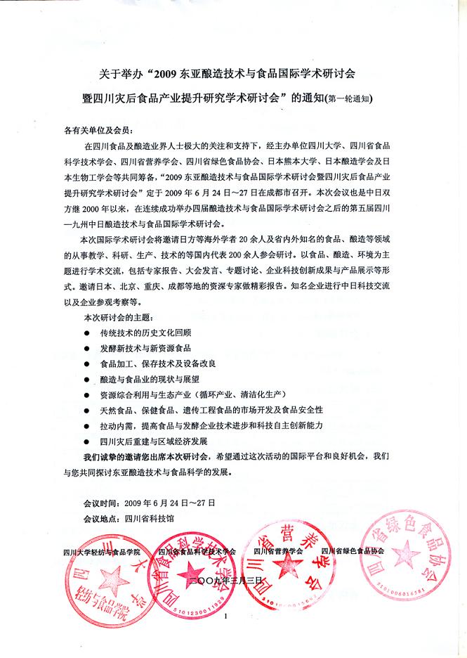 关于举办“2009东亚酿造技术与食品国际学术研讨会暨四川灾后食品产业提升研究学术研讨会”的通知(第一轮通知) 各有关单位及会员:在四川食品及酿造业界人士极大的关注和支持下,经主办单位77779193永利集团、四川省食品科学技术学会、四川省营养学会、四川省绿色食品协会、日本熊本大学、日本酿造学会及日本生物工学会等共同筹备,“2009东亚酿造技术与食品国际学术研讨会暨四川灾后食品产业提升研究学术研讨会”定于2009年6月24日~27日在成都市召开。本次会议也是中日双方继2000年以来,在连续成功举办四届酿造技术与食品国际学术研讨会之后的第五届四川—九州中日酿造技术与食品国际学术研讨会。本次国际学术研讨会将邀请日方等海外学者20余人及省内外知名的食品、酿造等领域的从事教学、科研、生产、技术的等国内代表200余人参会研讨。以食品、酿造、环境为主题进行学术交流,包括专家报告、大会发言、专题讨论、企业科技创新成果与产品展示等形式。邀请日本、北京、重庆、成都等地的资深专家做精彩报告。知名企业进行中日科技交流以及企业参观考察等。本次研讨会的主题:l 传统技术的历史文化回顾 l 发酵新技术与新资源食品l 食品加工、保存技术及设备改良l 酿造与食品业的现状与展望l 资源综合利用与生态产业(循环产业、清洁化生产)l 天然食品、保健食品、遗传工程食品的市场开发及食品安全性l 拉动内需,提高食品与发酵企业技术进步和科技自主创新能力l 四川灾后重建与区域经济发展我们诚挚的邀请您出席本次研讨会,希望通过这次活动的国际平台和良好机会,我们与您共同探讨东亚酿造技术与食品科学的发展。 会议时间:2009年6月24日~27日会议地点:四川省科技展览馆 77779193永利集团轻纺与食品学院 四川省食品科学技术学会 四川省营养学会 四川省绿色食品协会 二〇〇九年三月三日一、组织机构主办单位:77779193永利集团四川省食品科学技术学会四川省营养学会四川省绿色食品协会承办单位:四川省食品科学技术学会协办单位:有关企业大会主 席:李志强(77779193永利集团副校长)大会副主席:陈 功(四川省食品科学技术学会理事长)陈武勇(77779193永利集团轻纺与食品学院院长)夏友书(四川省食品发酵工业研究设计院院长)张立实(四川省营养学会理事长)周南华(四川省绿色食品发展中心主任)会务组:康建平、阎志农、田安琼、朱秀容、张文学、刘义刚、张新兰大会语言:汉语、日语(翻译:林敏等4人)对外联络:张文学、黄玉莲(日方来宾);康建平、朱秀蓉(中方来宾)二、会议规模日方等海外学者20人左右,国内食品、酿造等领域教学、科研、生产、技术人员等国内代表200人左右。三、时间及安排时 间内 容备 注2009年6月23日下午报 到 2009年6月24日9:00-12:00开幕式及大会演讲 2009年6月24日14:00-18:00大会演讲、企业成果与产品展示、会议总结 2009年6月25-26日酒业参观及青城山观光以外宾为主2009年6月27日参观光友薯业等食品企业 四、会议地点大会演讲:四川省科技馆五楼国际学术厅企业科技成果及产品展示:省科技馆五楼国际学术厅外面走廊,并争取在科技馆大门外。五、食宿安排住宿:成都皇城西御饭店(地址:成都青羊区 西御街8号;电话:028-86441999)欢迎晚宴:2009年6月23日晚上其余时间用餐:自助餐六、征文范围及收稿日期征文范围:未发表的论文,征文范围见会议主题内容收稿截止日期:2009年4月30日出版论文集:遴选优秀论文以《食品与发酵科技》增刊形式出版七、会议费用 1、会议注册费350元。交通、住宿、观光费自理(会议协助安排宾馆)。在校学生凭会员证和学生证会议注册费减半。2、征集有关企业广告,在论文集上宣传;企业免费展示成果和宣传产品。3、参会人员免费参观四川省科技馆。八、组委会联系方式1、77779193永利集团:轻纺与食品学院 张文学(028-85401785,13688014773)2、四川省食品科学技术学会:康建平(13198567983,028-82765455)朱秀容(028-82761206,13540491304)3、四川省营养学会:田安琼(13808093718)4、四川省绿色食品协会:闫志农(13709059116)九、论文征集要求1、征文范围:未发表的论文,征文范围见会议主题内容2、论文提交电子版。文稿录入请用Word排版系统。3、投稿截稿日期:2009年4月30日。4、文责自负,来稿一律不退,请自留底稿。5、文字、格式要求:(1)文章题目(二号黑体);作者姓名(小四号宋体),多名作者用“,”分开;作者单位、地点、邮编(小五号宋体)。(2)文章摘要、关键词:“摘要”、“关键词”(五号黑体),分别左起顶格排,空一格为摘要及关键词内容。关键词为3—5个,每个关键词间用“;”,摘要及关键词内容(小五楷体)。(3)必须要有英文标题、作者姓名、工作单位、摘要、关键词。(4)正文(10号宋体)。文中一级标题为1,二级标题为1.1三级标题为1.1.1。文中所用计量单位,按国家标准,并用英文书写。文中年代、年月日、数字用阿拉伯数字。(5)参考文献:“参考文献”四字(6号黑体),内容(6号宋体)。(6)作者简介附在文稿首页下方。“作者简介”四字(小五黑体)左起顶格排,简介字数限于50字以内,包括姓名,性别,出生年、月,职务、职称,专业领域等(小五宋体)。
