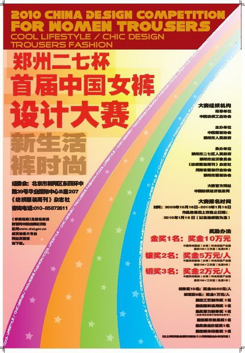 ◆ 大赛主题:新生活; “裤”时尚 主题诠释:对于新生代消费者来说,“酷”是一种生活态度,女裤也可以穿出时尚,穿出新时代的生活态度。女裤作为一种服装文化的载体,既要酷又要不失女性的时代风貌。大赛组织机构: 指导单位:中国纺织工业协会 主办单位:中国服装协会、郑州市人民政府 承办单位: 郑州市二七区人民政府、郑州市经济委员会、《纺织服装周刊》杂志社、河南省服装行业协会、郑州市服装协会 大赛官方网站:中国纺织经济信息网 ◆ 大赛报名时间: 时间:2009年10月16日-2010年1月16日 作品效果图上交截止日期: 2010年1月16 日(以当地邮戳为准)◆ 作品要求: 参赛项目主要为女裤,女裤类型不限,既可以是正装女裤、休闲女裤、时装女裤、也可以是创意女裤。在突出女裤设计的同时,注重上衣及外套搭配为辅。每位(组)参赛选手根据自己对大赛主题的理解和诠释向评委会提供5套作品彩色效果图。 本次大赛是女裤专业大赛,要求2件作品必须与衬衫或者T恤衫搭配。其他3件作品自由发挥。作品要有鲜明的时尚感,在紧扣主题的基础上,表达出与时俱进的新时代生活方式。 作品注重整体搭配,可以配合鞋帽、皮带、挎包、佩饰等。 作品设计手法、运用材料、配饰不限,注重创意和实用相结合。◆ 评选办法: 大赛评委团由7位国内外知名院校专家、著名服装设计师、资深媒体人士、时尚界权威人士、著名商业集团专业人士组成。评委团将根据作品的创意、造型、结构、色彩、材料、工艺、服饰搭配、现场展示效果、商业价值等进行综合评判。大赛由报名、预赛、决赛三个阶段组成。 ●报名(2009年10月16日-2010年1月16日) 大赛组委会在活动开始前3个月,集中由各大媒体发布赛事预告和报名通知(报名表),最大范围地组织业内知名、优秀的服装设计师广泛参与。根据媒体形态、定位和受众不同,选择相应刊登内容,使其相互补充,并为赛事全程做宣传报道计划,达到传播最大化、最有效。 ●预赛(2010年1月底)地点:郑州(或北京) 每位(组)参赛选手根据自己对大赛主题的理解和诠释向评委会提供5套作品(彩色效果图)。评委会从参赛的彩色效果图中评选出20位(组)选手入围决赛。预赛结束后,组委会给入围决赛的20位(组)选手提供成衣制作补助费3000元,制作周期为1个半月。完成成衣制作后,参加决赛评选。 ●决赛及颁奖晚会(2010年3月中旬) 决赛地点:郑州 决赛以模特动态展示成衣作品的形式进行现场评判。评委会将根据作品的创意、造型、结构、色彩、材料、工艺、现场展示效果、商业价值等进行综合评判,现场决出最终获奖选手。◆ 奖励办法: 金奖1名,奖金10万元; 中国郑州服装(女裤)时尚创意产业园提供100㎡工作室(免费5年)。 银奖2名;奖金5万元/人; 中国郑州服装(女裤)时尚创意产业园提供100㎡工作室(免费3年)。 铜奖3名;奖金2万元/人; 中国郑州服装(女裤)时尚创意产业园提供100㎡工作室(免费1年)。 优秀奖10名, 奖金5000元/人。 单项奖6名: 奖金1万元/人 最佳工艺制作奖 1名 最佳面料运用奖 1名 最具潜力新秀奖 1名(此奖项仅仅限于在校学生参与) 最佳展示效果奖1名 最具商业价值奖1名 最佳媒体印象奖 1名 (以上所有奖金金额均为税前,个人所得税由主办单位代缴) 入围选手名单和获奖选手名单、作品将由《纺织服装周刊》中国纺织经济信息网等行业权威媒体刊登,重点介绍选手以及获奖作品。◆ 参赛指南:1.选手性别、年龄、学历、国籍、民族不限。国内外专业服装设计师、专业院校师生均可参赛。2.参赛作品为5套以女裤为设计主体组成的女装系列,要求2件作品必须与衬衫或者T恤衫搭配。有整体感,符合大赛设计主题及宗旨。3.参赛者须提交以下报名材料:(1)报名表,表上请如实填写真实信息,以及联系方式,并附近期2寸照片一张;(2)5套以女裤为主的系列服装的彩色效果图(27cm×40cm)、设计主题说明和设计构思、面料小样(8cm×8cm)。效果图左上方标明作品名称,右下方贴面料小样,效果图手绘及电脑绘图不限。(4)设计作品款式结构图。(5)本人身份证复印件一份。(6)1张2寸近照;4.稿件一律不予退还,请自留底稿;参赛者及入围者必须遵照大赛组委会规定的期限递交参赛作品,逾期者将不予受理或被取消其参赛资格。5.参赛作品成衣规格:参见国际标准,入围决赛前组委会会将模特尺寸通知到每位选手本人。6.参赛作品须为参赛本人从未参加过其他大赛的原创设计作品。允许两人联合投稿。入围作品将在官方网站上进行公示,不得一稿多投和抄袭他人作品,否则一经发现组委会有权取消违规者的参赛资格。7.获奖选手须根据大赛组委会的日程安排出席彩排及宣传活动。8.所有参赛作品服装、效果图版权归组委会所有。组委会有权对所有参赛作品进行宣传、品牌植入、出版发行、演出及组织相关行业使用,并以任何形式使用有关图片及影像,无须支付任何版费。9.所有参赛者所填写的资料(包含个人信息)必须真实有效;如发现不实者,将取消其比赛资格。10.本次大赛最终解释权归“郑州二七杯•首届中国女裤设计大赛”组委会。 组委会:北京市朝阳区东四环中路39号华业国际中心B座207 《纺织服装周刊》杂志社 咨询电话:010—8587 2618 ;8587 2611; 8587 2613联 系 人: 李梅 徐松 衣楠邮寄地址:北京市朝阳区东四环中路39号华业国际中心B座207 《纺织服装周刊》策划部 收 邮