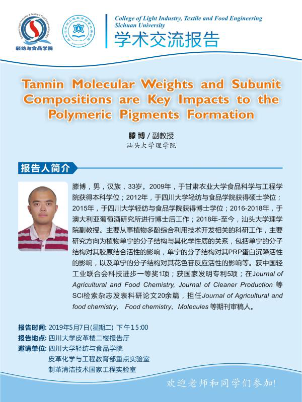 讲座主题:Tannin Molecular Weights and Subunit Compositions are Key Impacts to the Polymeric Pigments Formation