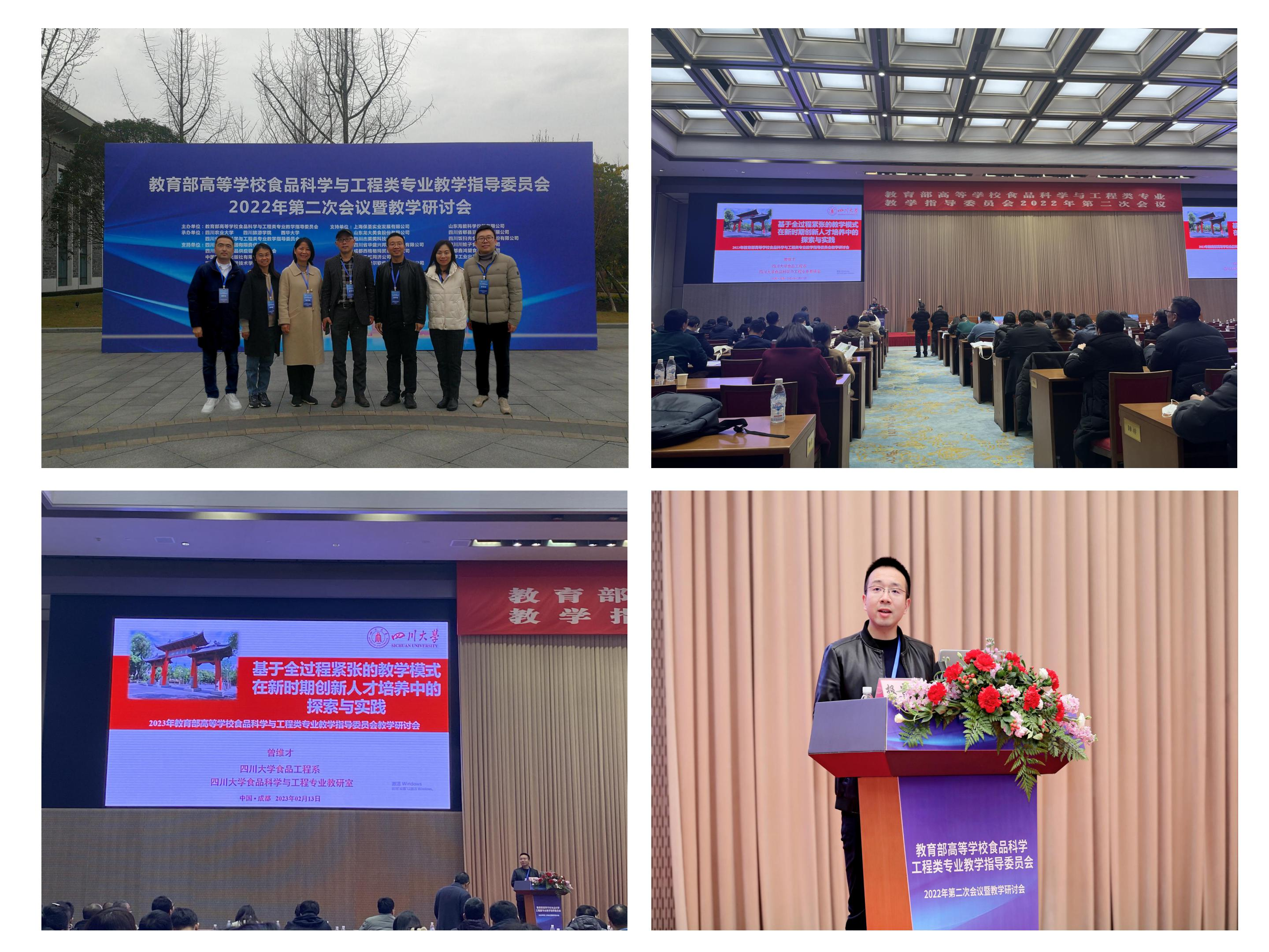 2023年2月13日,教育部高等学校食品科学与工程类专业教学指导委员会2022年第二次会议暨教学研讨会在成都召开。我院食品工程系何强、迟原龙、吕远平、曾维才、赵志峰、段飞霞和董怡等7位老师应邀出席大会,并就“新工科背景下食品专业本科教育的升级出发”及“食品科学与工程专业思政课程的建设”等主要议题积极参与大会的教学研讨。曾维才老师应邀做题为“基于全过程紧张的教学模式在新时期创新人才培养中的探索与实践”的大会交流报告。各位老师也与全国食品专业的各相关兄弟院校在创新人才培养、专业工程认证、创新创业教育体系的构建等方面进行了深入交流与探讨。