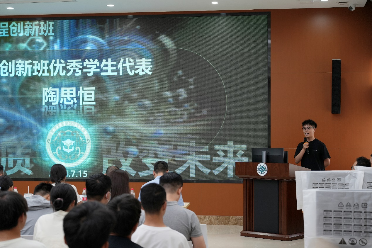 随后,2021级创新班优秀学生代表陶思恒上台发言,分享了他在创新班学习生活的宝贵经验和感悟。