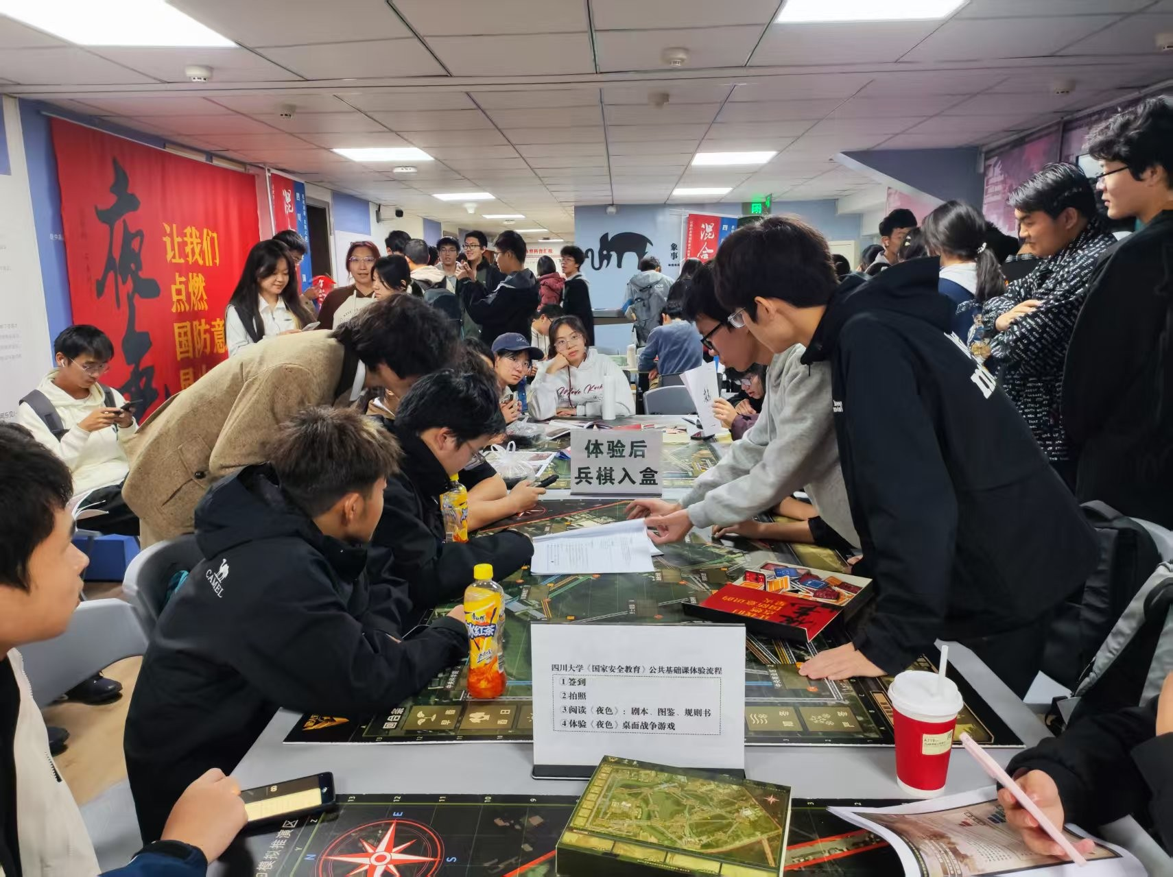 随后,《桌面战争·夜色》剧本及规则讲解环节拉开序幕,瞬间点燃了大家的参与热情。值得一提的是,该桌游以川大校园真实地形为蓝本设计,巧妙融入战略部署、情报分析等军事元素,规则设计兼顾专业性与趣味性,让同学们倍感亲切。师生一同认真研究剧本及游戏规则,不时就地形细节、推演逻辑等进行交流,为后续的实践环节做好充分准备。