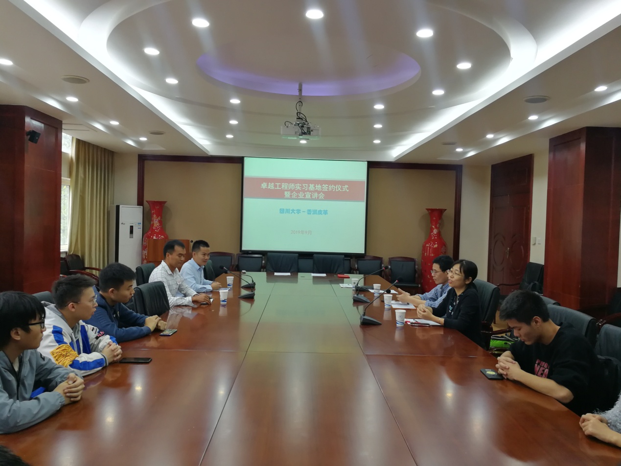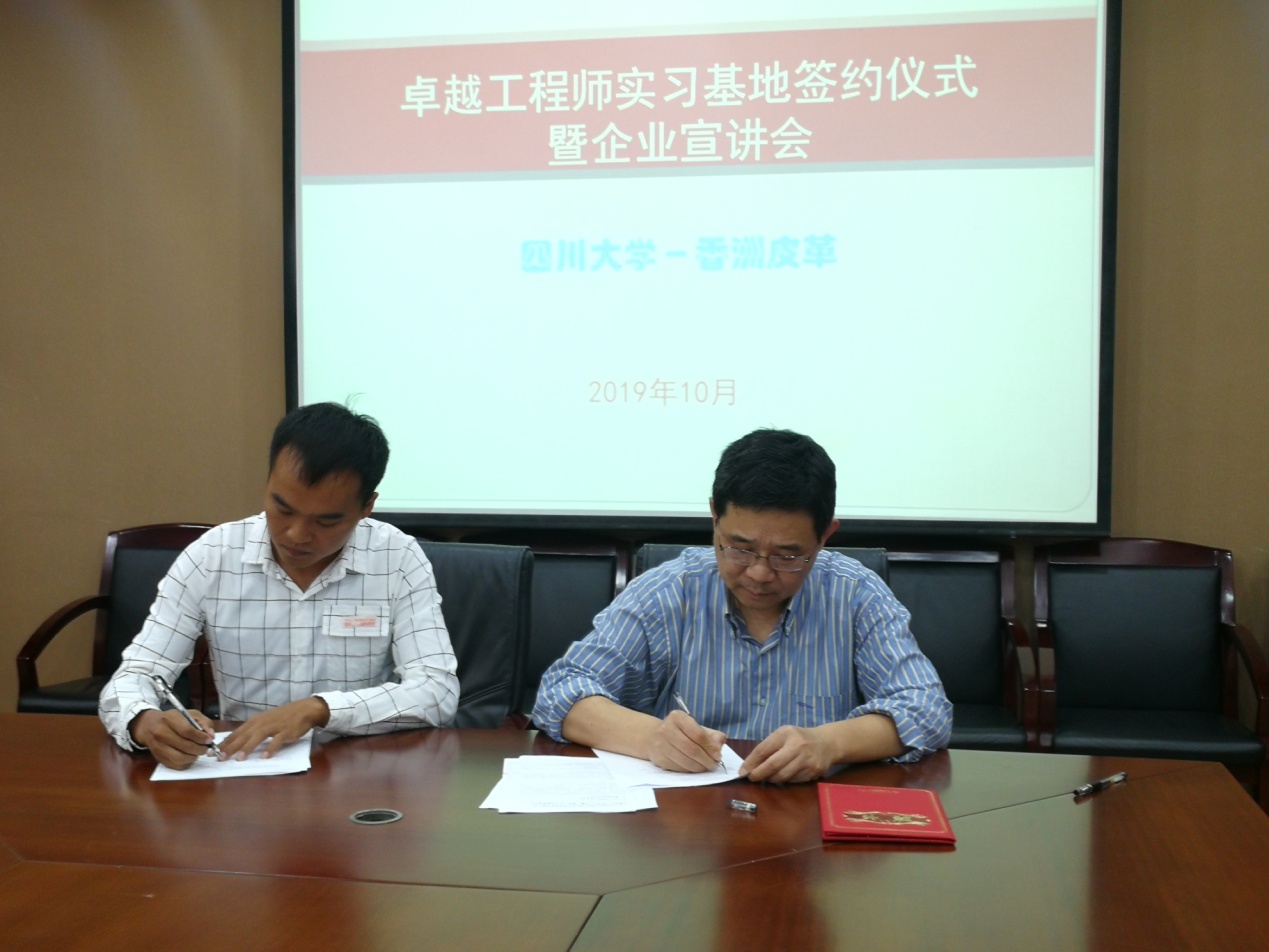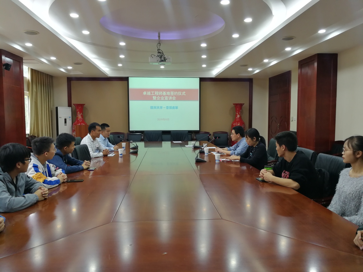 2019年10月14日下午2:30,77779193永利集团轻工科学与工程学院与漳洲香洲皮革有限公司“共建卓越工程师实习基地签字仪式暨企业宣讲会” 在皮革楼209会议室顺利举行。77779193永利集团轻工科学与工程学院副院长彭必雨教授、生物质与皮革工程系系主任林炜教授、皮革工程教研室主任但年华副教授、漳洲香洲皮革有限公司执行副总林汉彬、人力行政部傅国润经理及2016级本科生出席了本次会议。